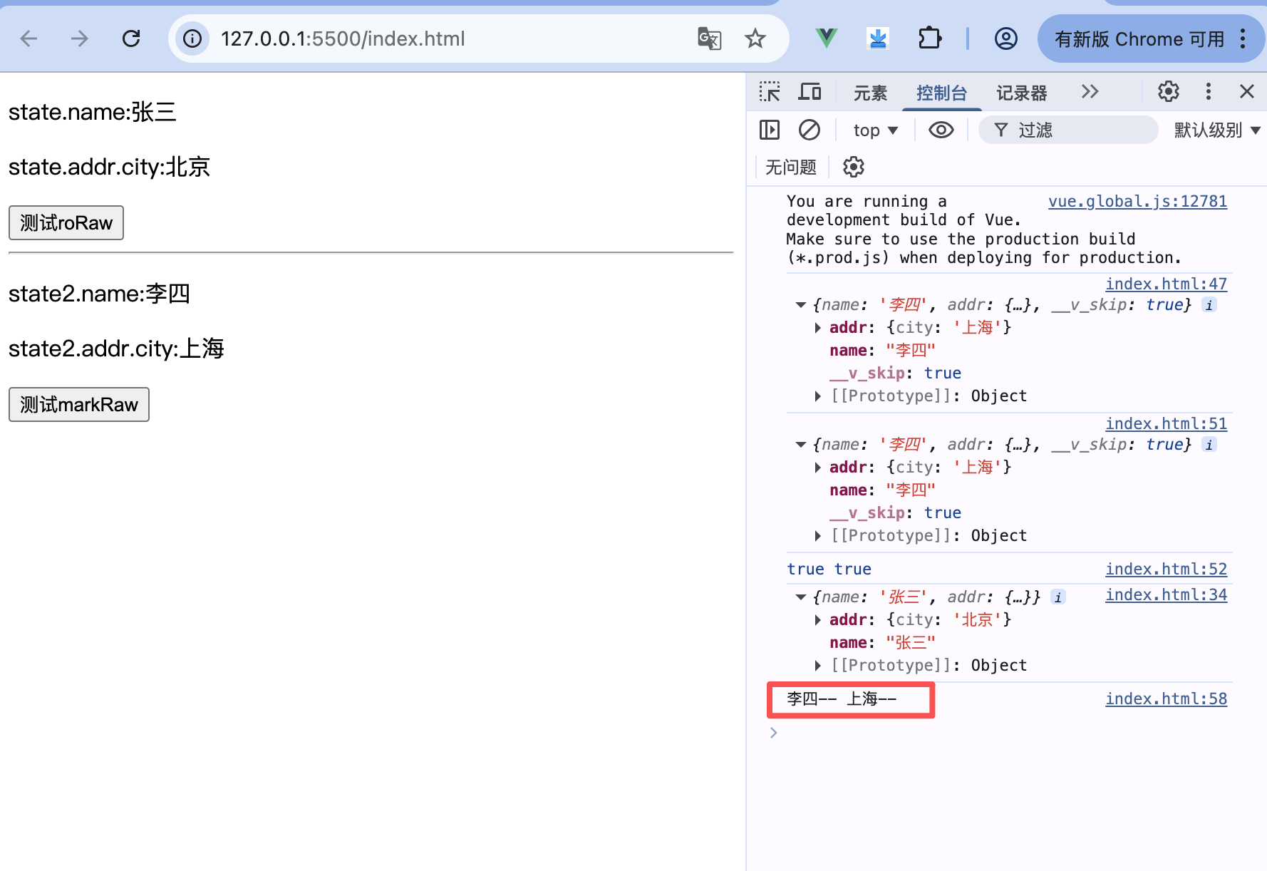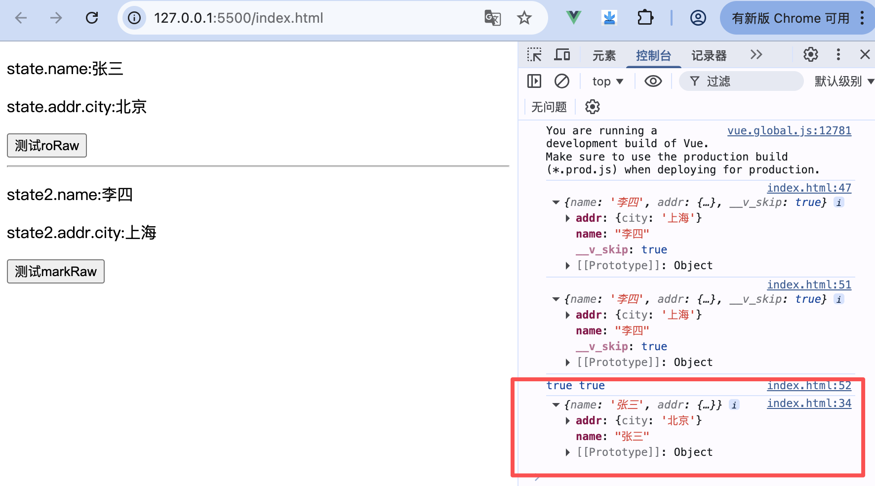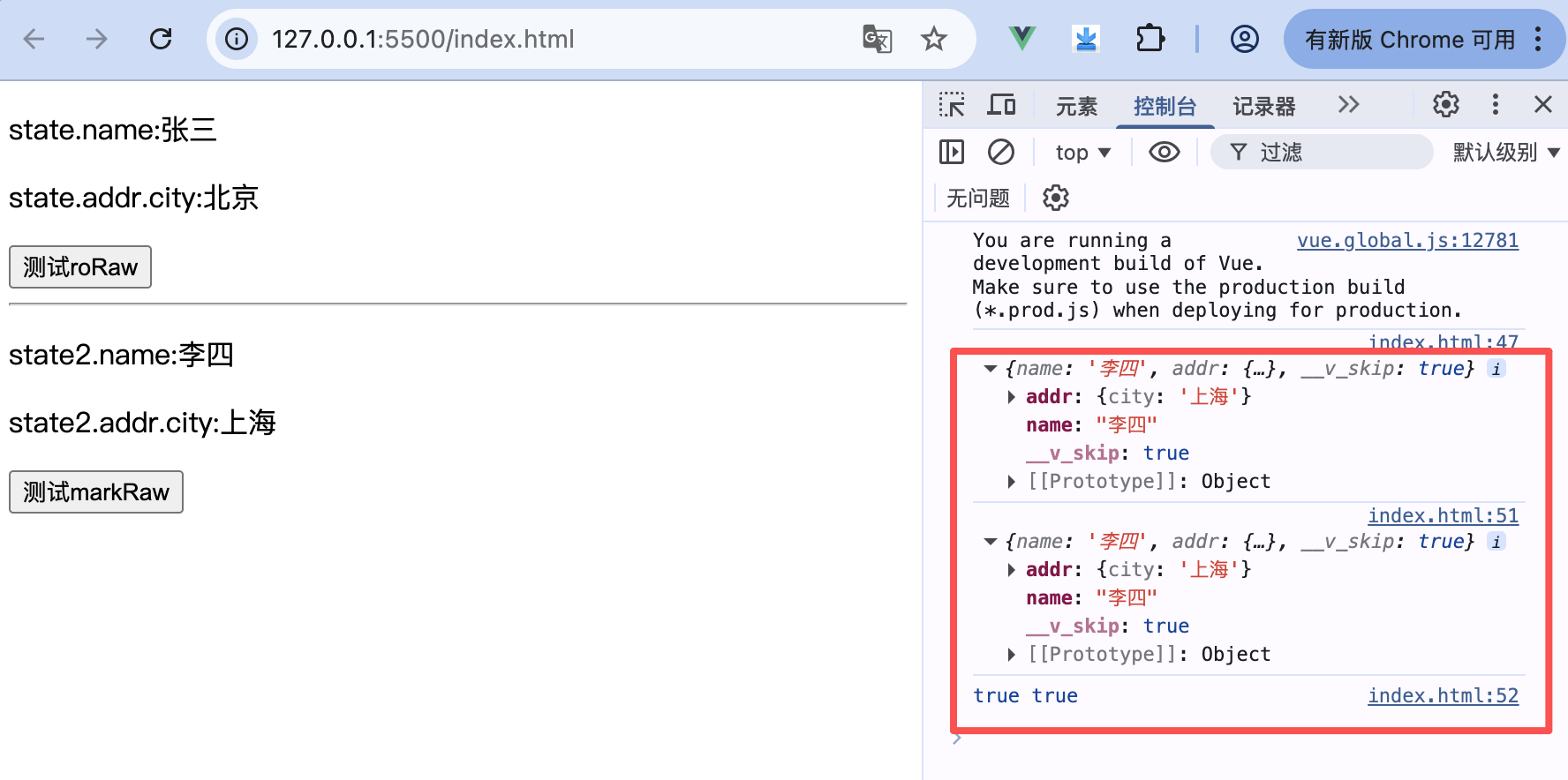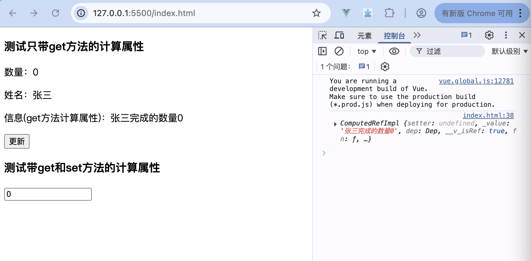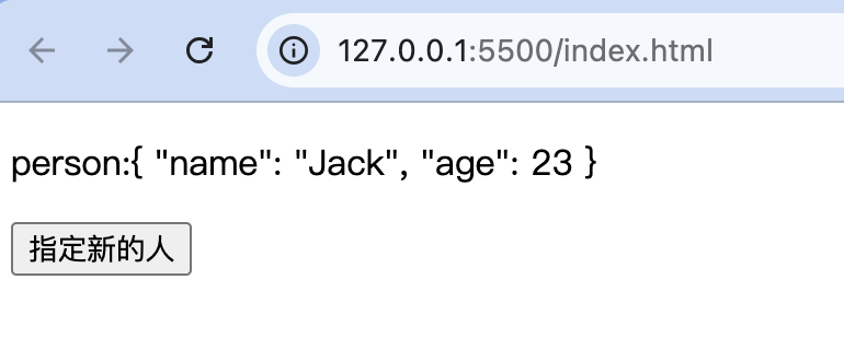 在上面的代码中,我们分别定义了一个ref对象countObj和一个reactive对象person,同时定义了一个准备更新数据的update函数,并通过return返回数据。在模板中读取了ref对象和reactive对象的数据并进行动态显示,将update函数绑定给按钮的点击监听。运行后的页面效果如图所示。