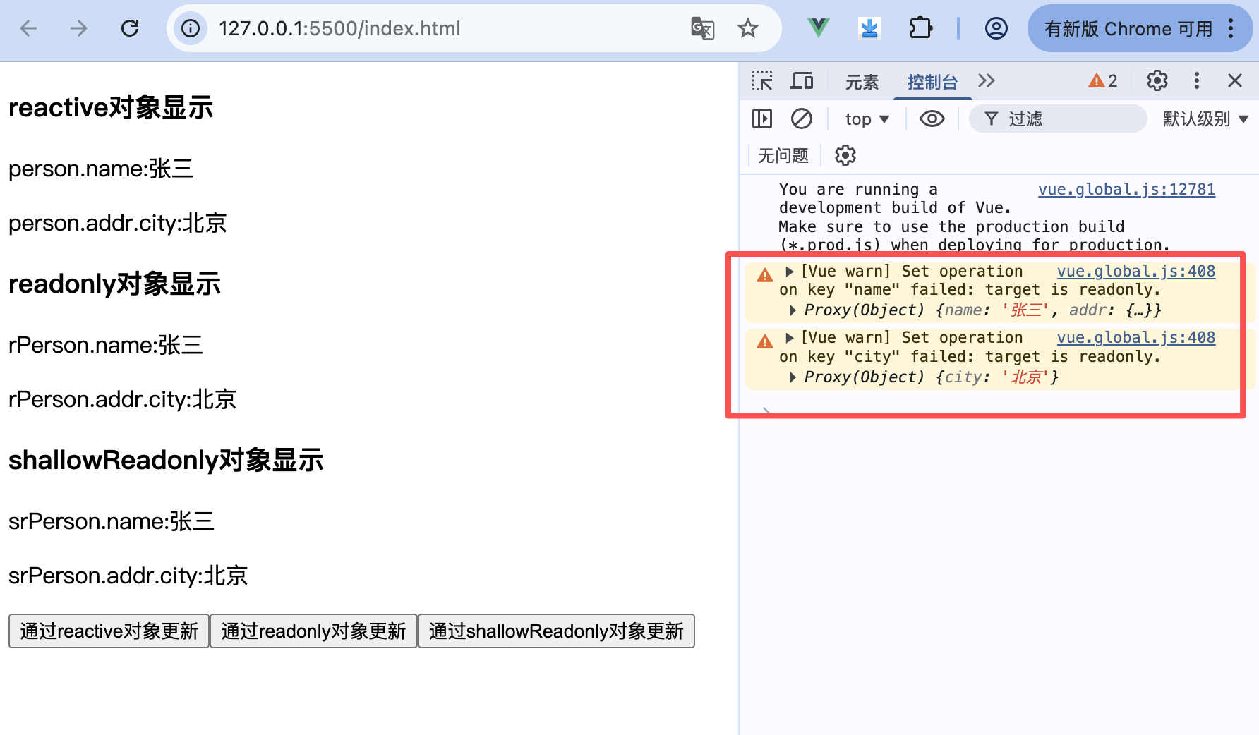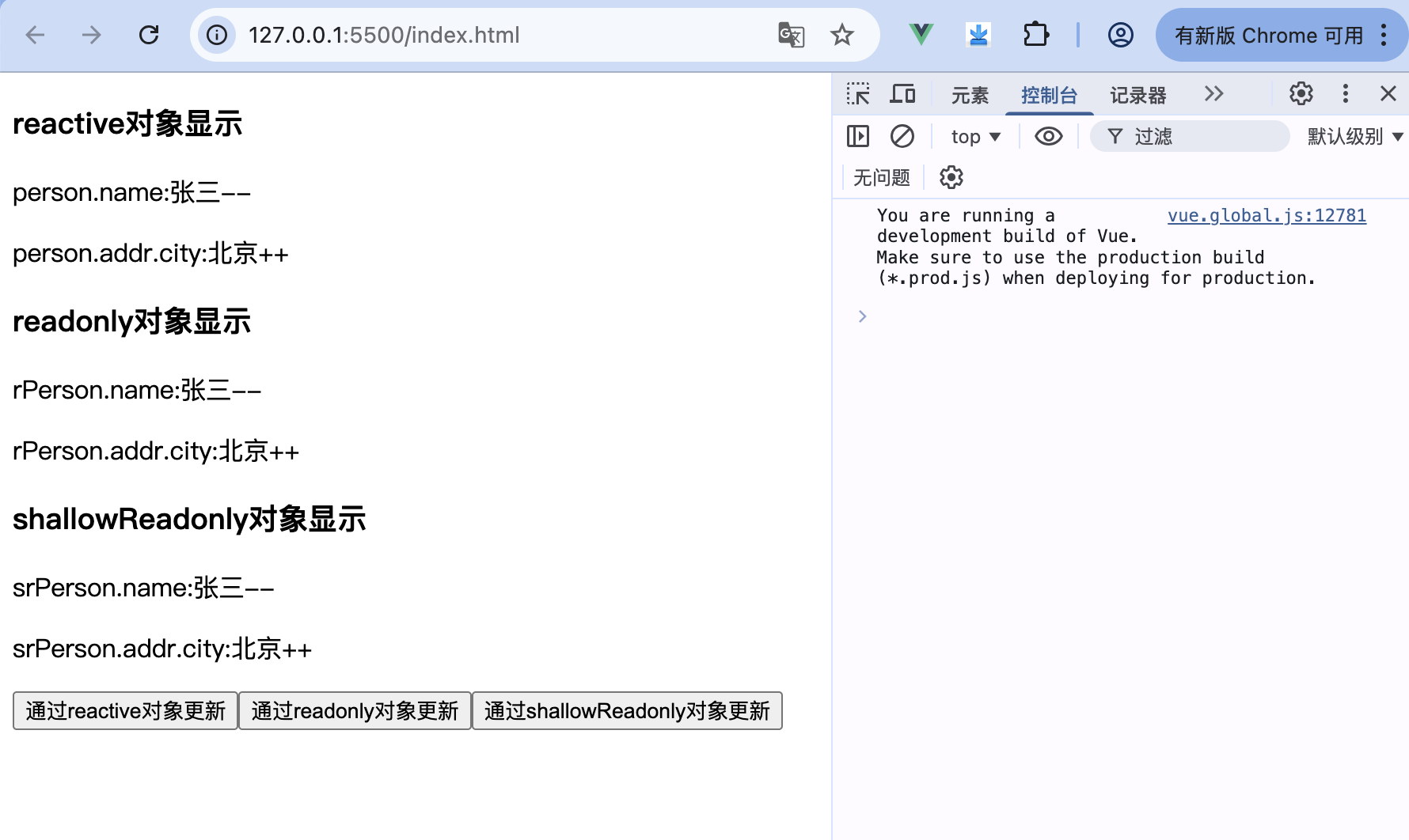 使用watch函数监听reactive对象,默认进行的是深度监听。在按钮的点击回调中,无论是对person对象的浅更新,还是深度更新,监听的回调都会执行,代码如下。