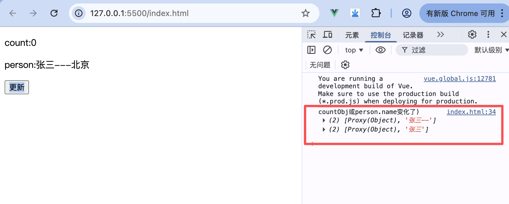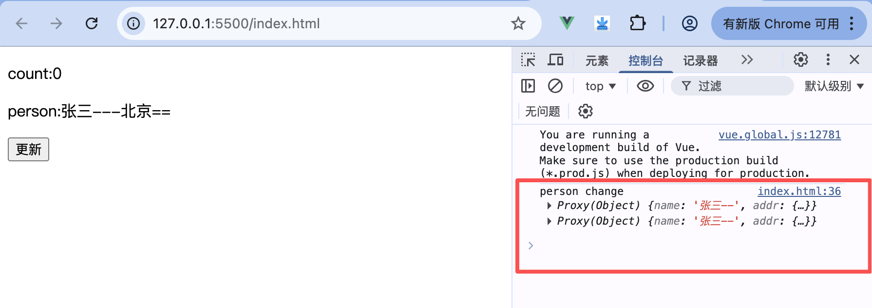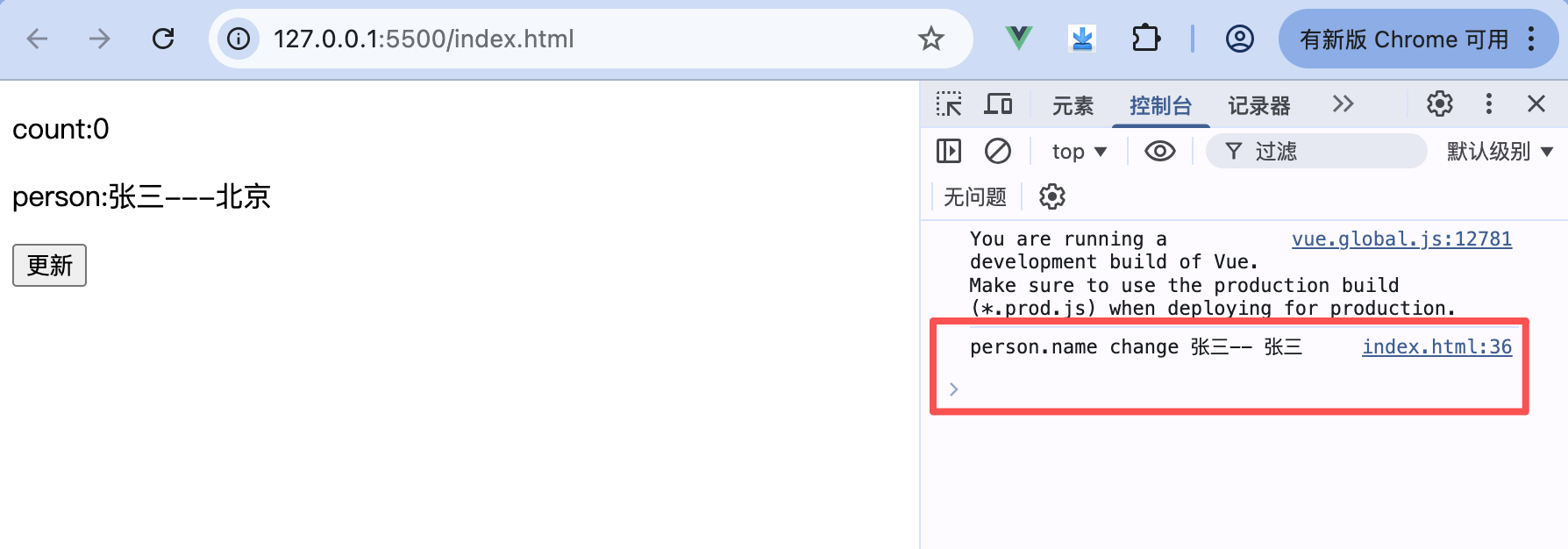 如果在更新函数中通过reactive对象person更新name属性,监听的回调就会执行,代码如下。