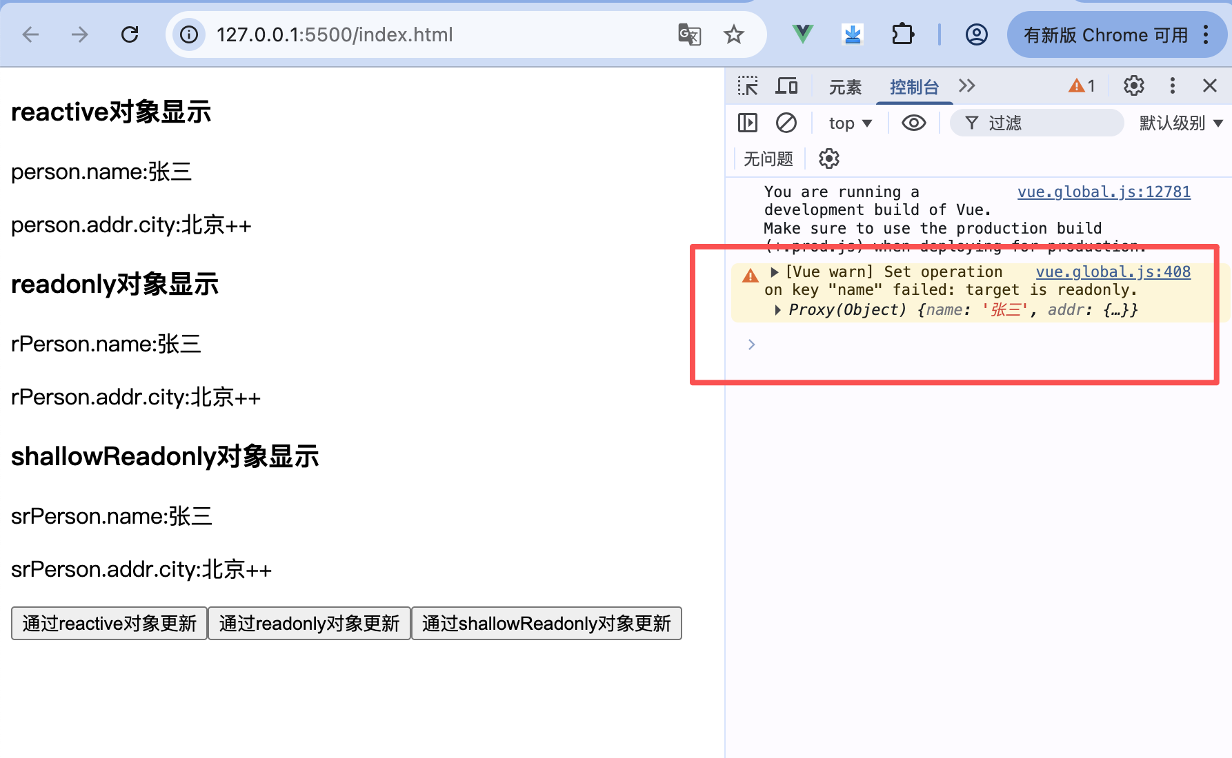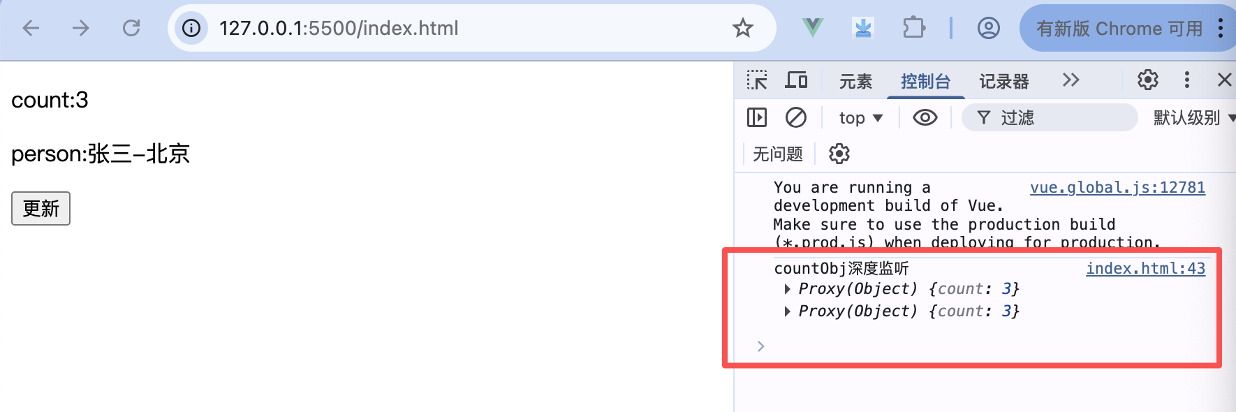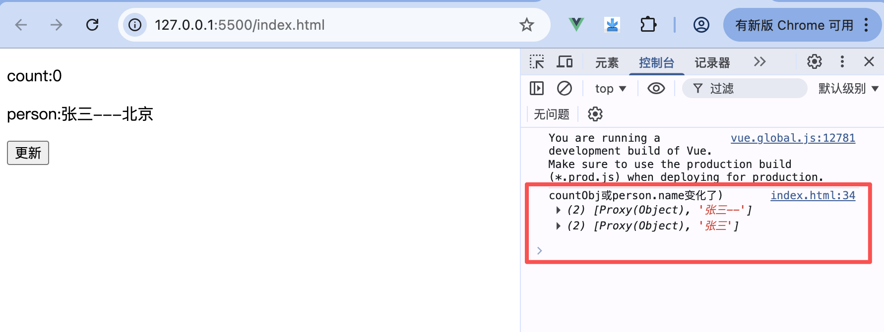 如果在更新函数中通过reactive对象person更新name属性,监听的回调就会执行,代码如下。