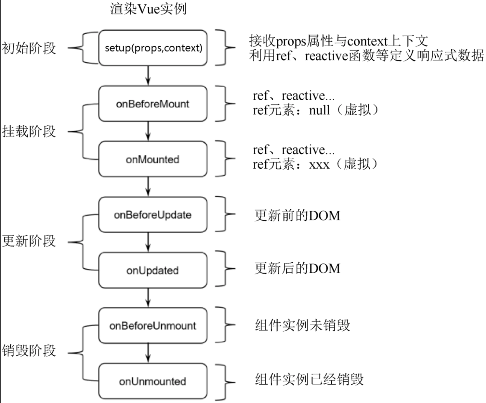 组合式API的生命周期钩子函数共有4个阶段,如图所示。下面结合代码进行具体说明。