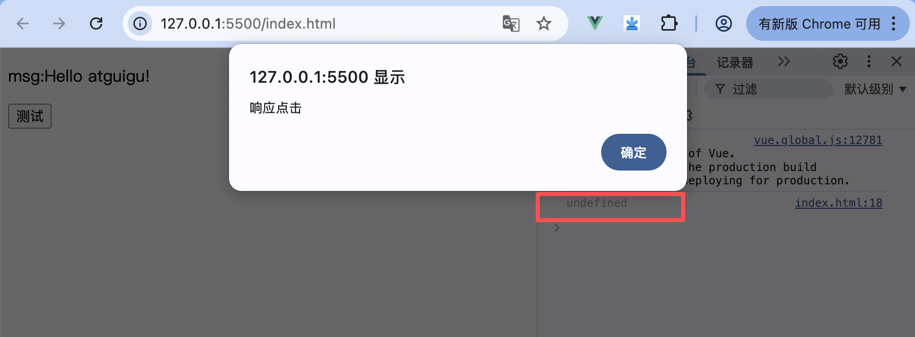输出的this是undefined,对象中的msg属性值在模板中直接显示在页面上。点击"测试"按钮后,handleClick函数就会自动调用,从而显示警告提示,如图所示。