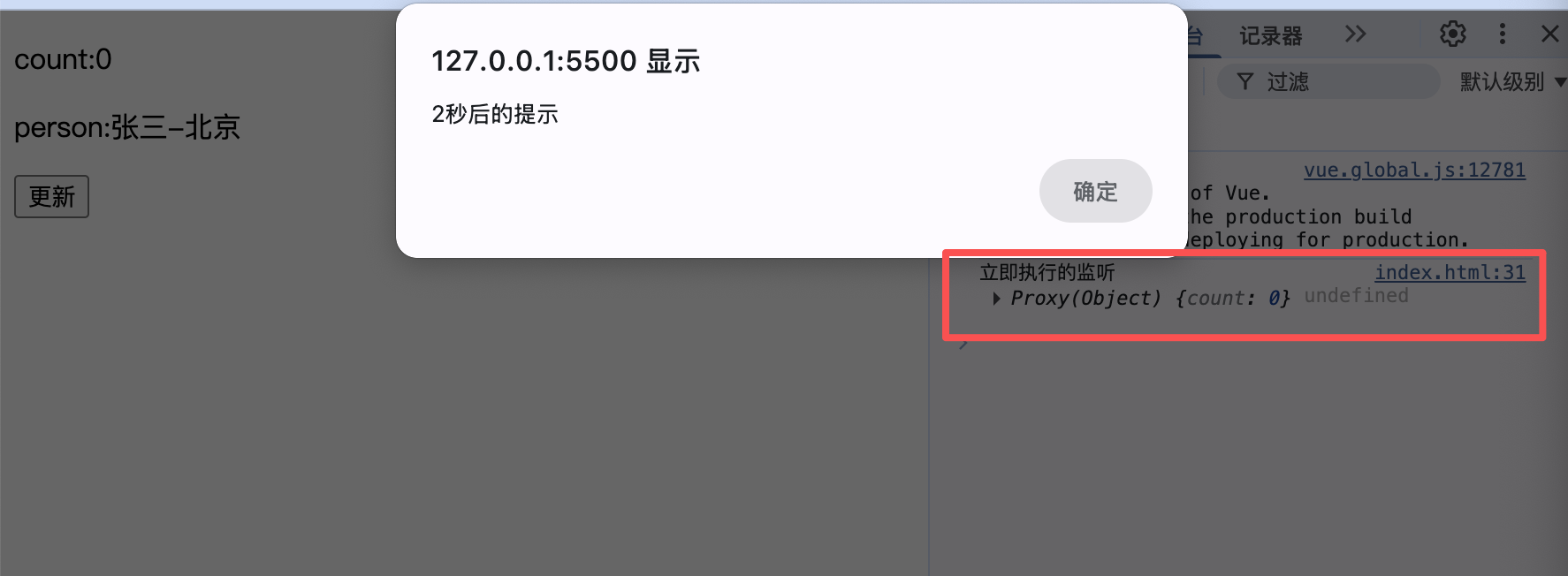 在初始化时监听的回调就会执行一次,且在2秒后显示警告提示,当然在点击按钮后,监听的回调还会再次执行。