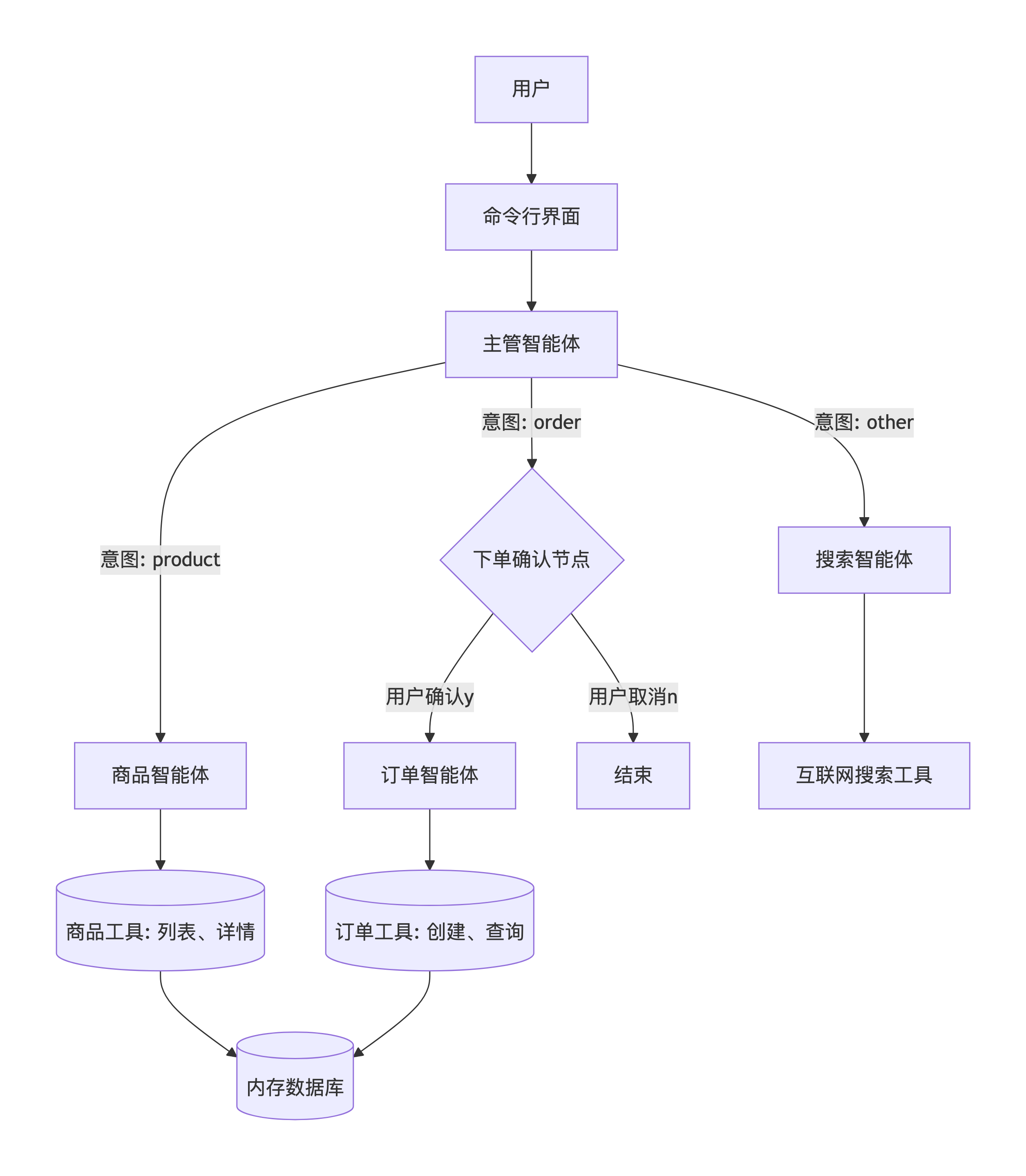 传统的单体聊天机器人把所有逻辑塞进一个 prompt 里,当业务变复杂(商品查询、下单、支付、物流、售后)时,prompt 会变得臃肿不堪,难以维护。多智能体架构将不同职责拆分为独立的智能体,每个智能体拥有专属的工具集和系统提示,由一个"主管"负责路由,就像公司里不同部门各司其职。