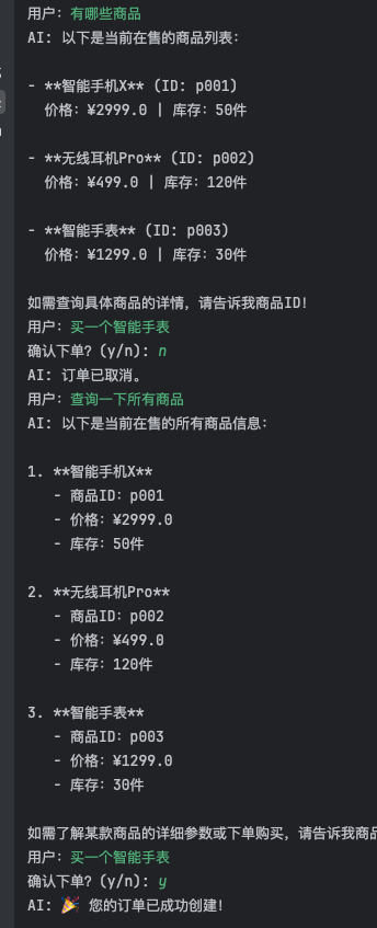 order时,图会在order_agent节点前暂停,等待用户确认(y/n)。 -