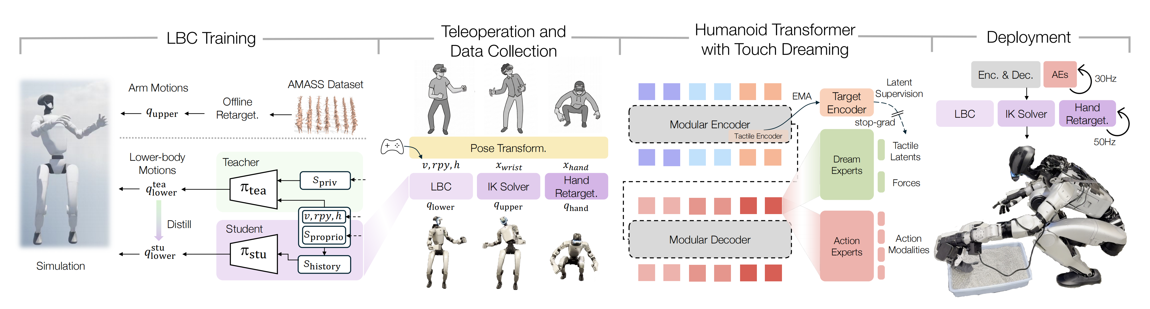 总之,该系统由四个阶段构成:1 下肢控制器(LBC)训练、2 基于 VR 的遥操作与数据收集、3 使用带触觉梦境机制的人形Transformer(Humanoid Transformer with TouchDreaming,HTD)进行策略学习,以及 4部署