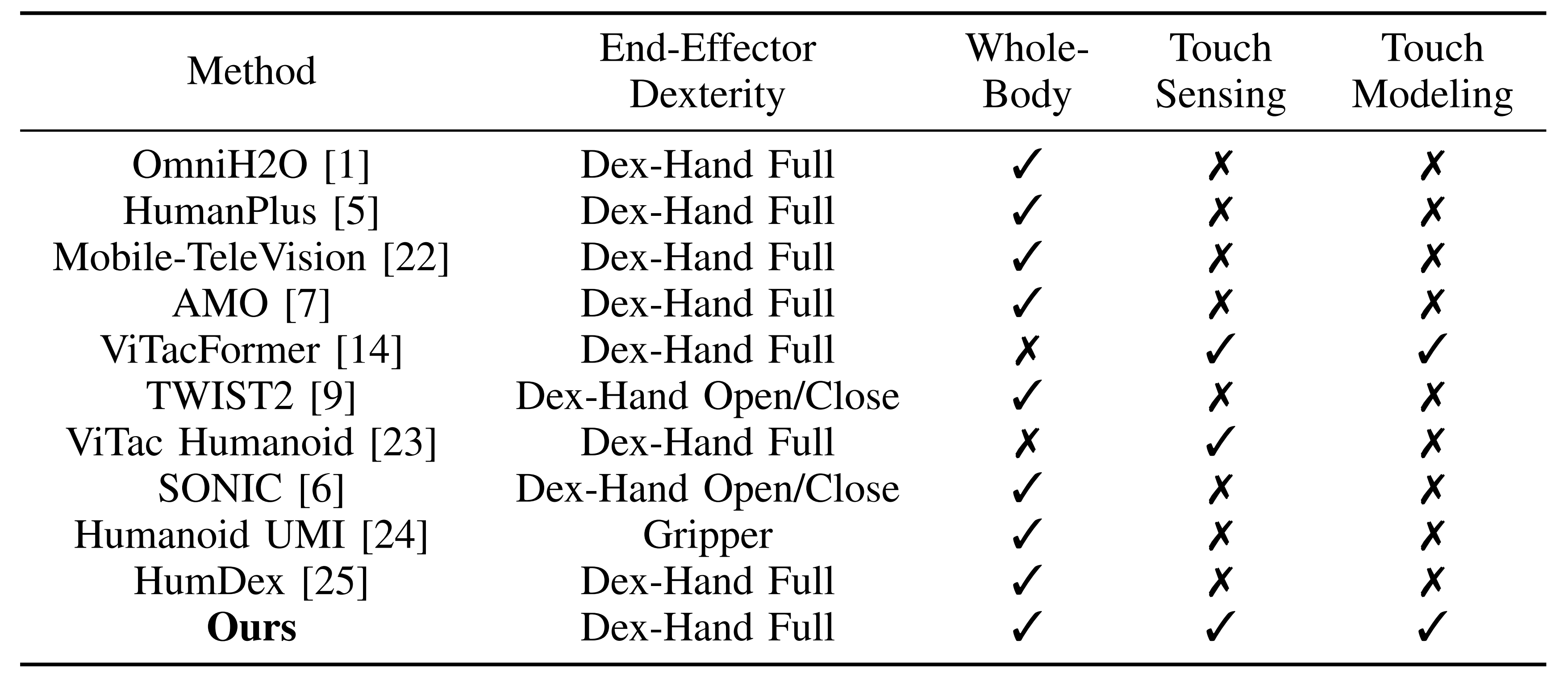然而,这些方法大多没有引入触觉传感,更少有在学习到的策略中显式建模触觉信号。与之相对,以触觉为中心的工作,如 ViTacFormer[14] 和 Kwon 等人 [23] 提出的人形视觉-触觉-动作数据集,展示了触觉信息的价值,但并未提供一种能够同时结合全身控制、完整端执行器灵巧性、触觉传感和触觉建模的人形操作系统