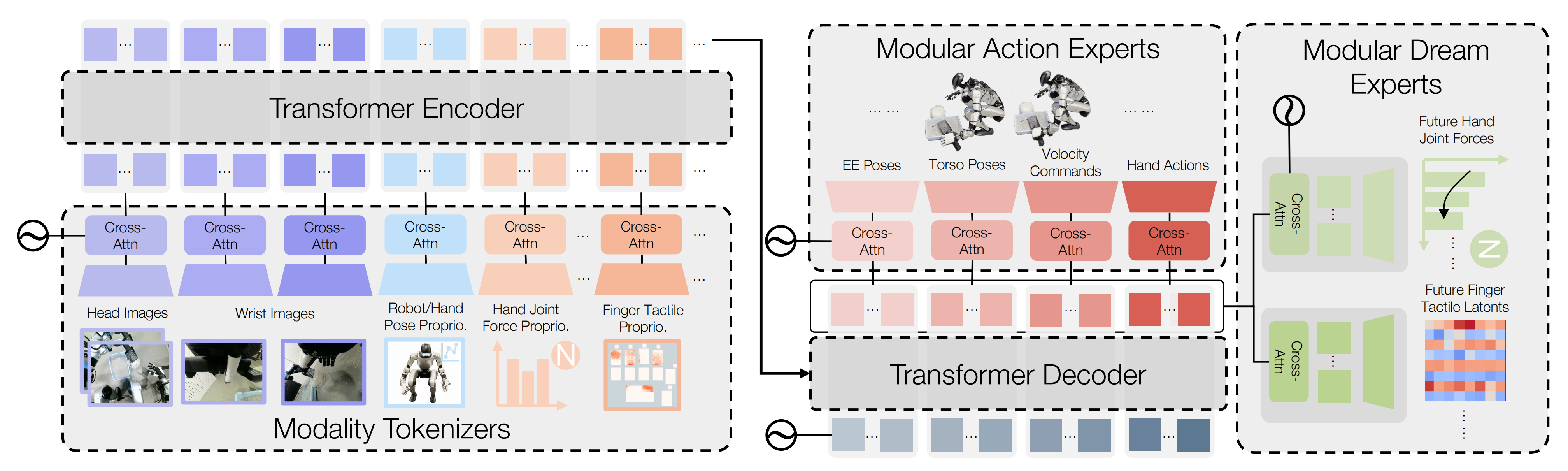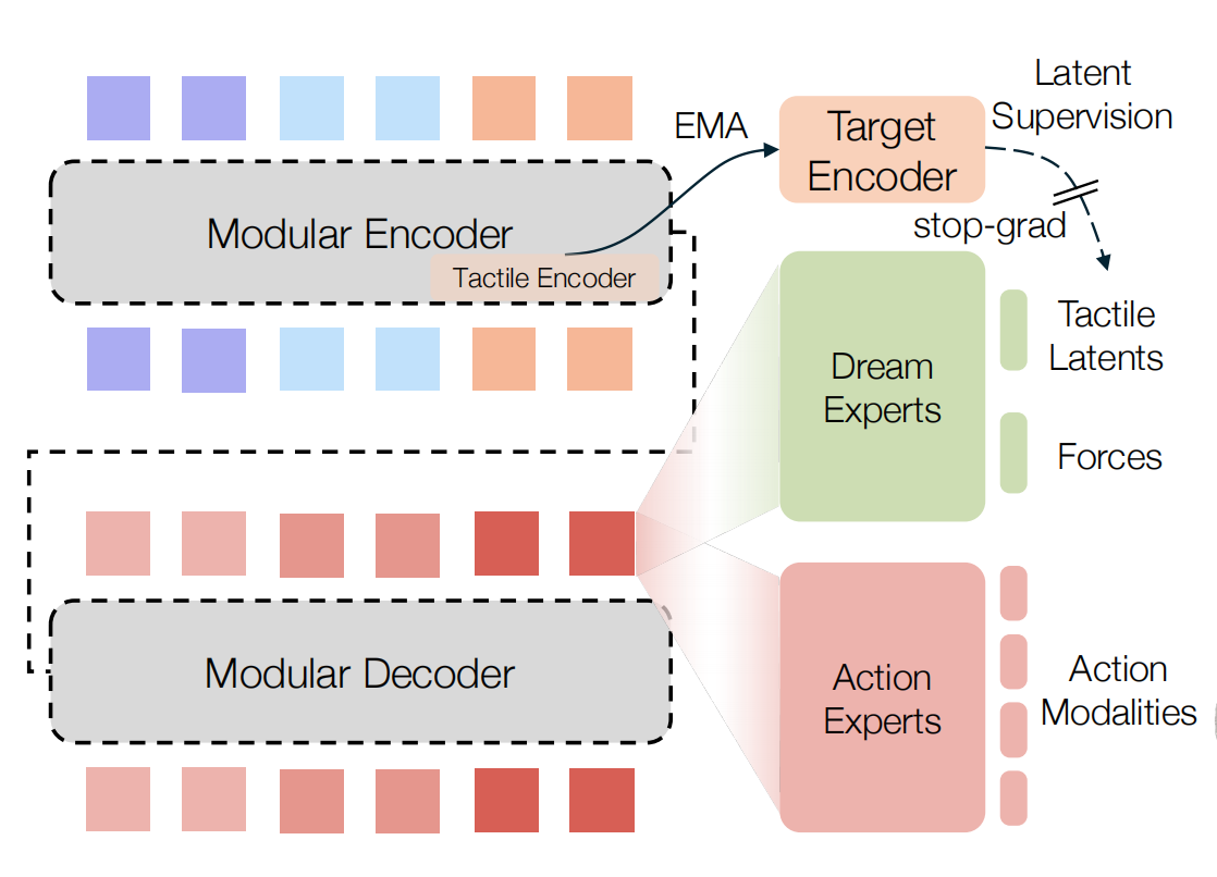 - 在输出端,作者同样使用独立的动作专家对不同的动作模态进行解码,并使用专门的"梦境专家"来解码触觉梦境(touch-dreaming)目标