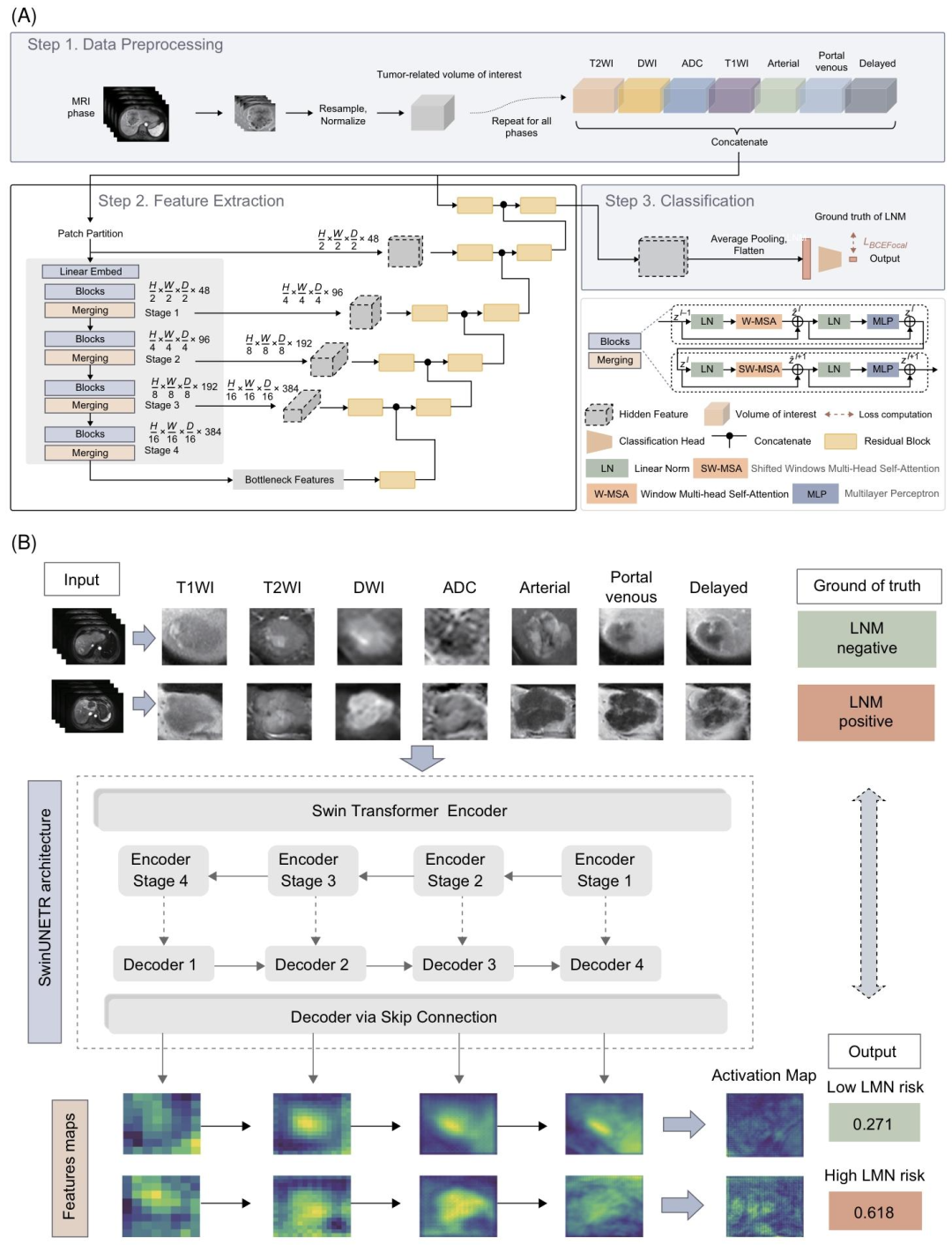 **方法:**MRI多序列(T2WI、DWI、ADC、T1WI、动脉期、门脉期、延迟期) → 肿瘤感兴趣容积(VOI)提取与预处理 → Swin UNETR编码器(滑窗自注意力)提取多尺度特征 → 解码器(U‑Net风格)重建特征图 → 平均池化+展平 → 分类头(线性层+Sigmoid)输出SwinU评分(LNM概率) → BCEFocalLoss处理样本不平衡 → 5折交叉验证+集成学习(平均输出) → 单因素/多因素逻辑回归(整合SwinU评分、Node‑RADS分级、肿瘤直径>5cm、多发肿瘤)构建SwinU‑CliRad模型 → WES分析(突变谱、KRAS/TP53共突变) → bulk RNA‑seq(WGCNA识别与SwinU/LNM相关的基因模块) → PPI网络筛选hub基因(MUC5AC) → GO/KEGG富集分析 → scRNA‑seq(BayesPrism反卷积细胞组成,CellChat分析配体‑受体通讯) → 组织学亚型(大导管型 vs. 小导管型)比较 → NAT队列验证(pCR、MPR、RVT‑PT)。