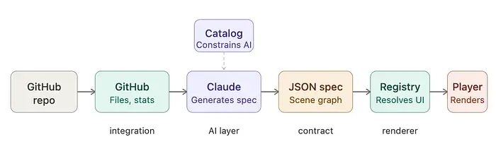 GitHub 集成提供数据。JSON Render 设置定义模型可以使用的组件。Prompt 是视频成形的地方。当提交仓库链接时,API 获取 GitHub 数据,catalog.prompt()(位于 ./lib/catalog.ts)构建一个结构化 prompt,告诉模型哪些场景组件可用,并指示它根据在仓库中发现的内容选择、排序和填充它们。