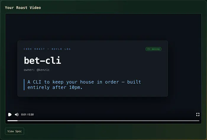 输入任何公共 GitHub 仓库。例如,https://github.com/kenzic/bet-cli。应用获取仓库数据,发送给 Claude,并将结果渲染为视频。每个仓库根据模型发现的内容产生不同的场景序列。