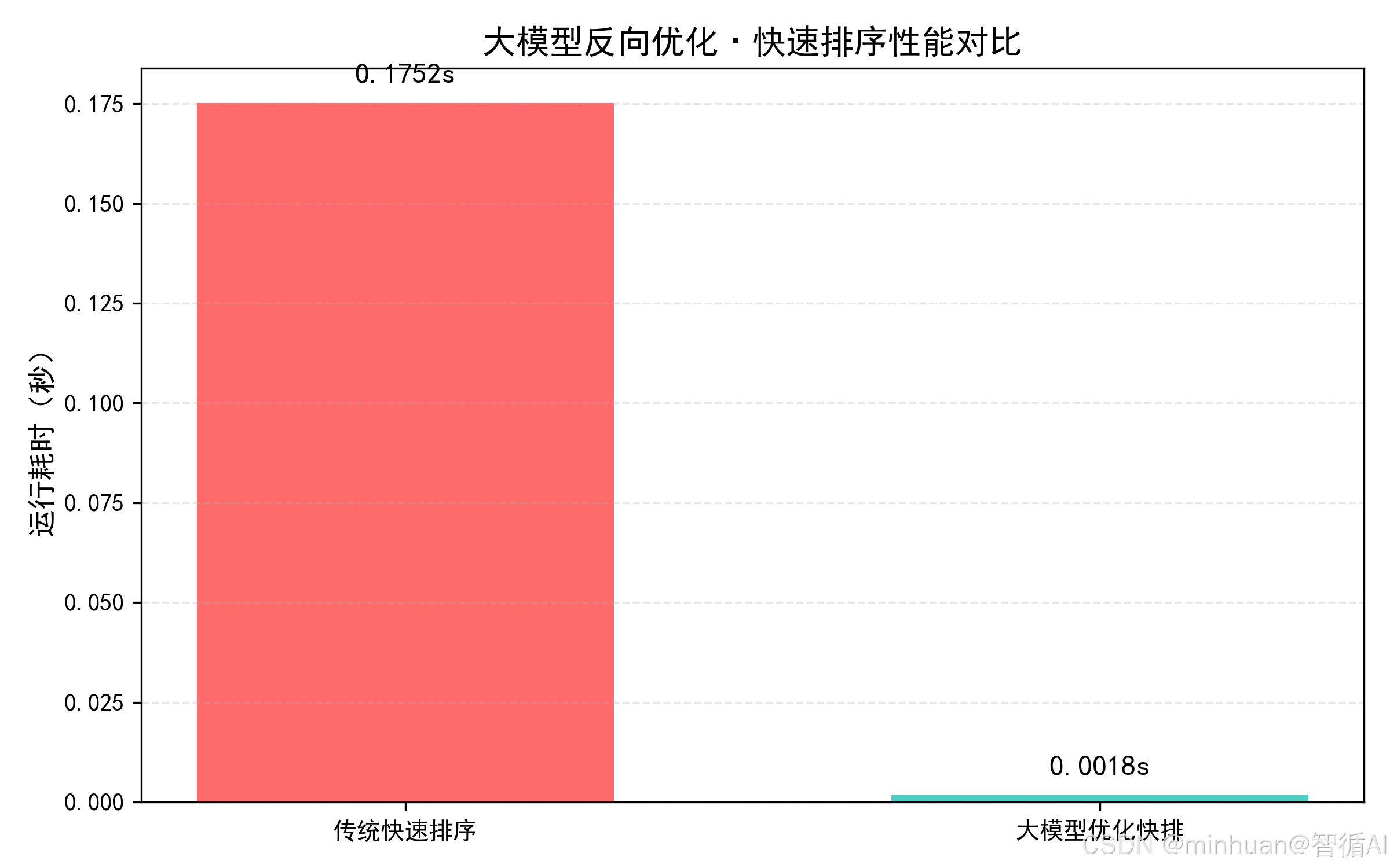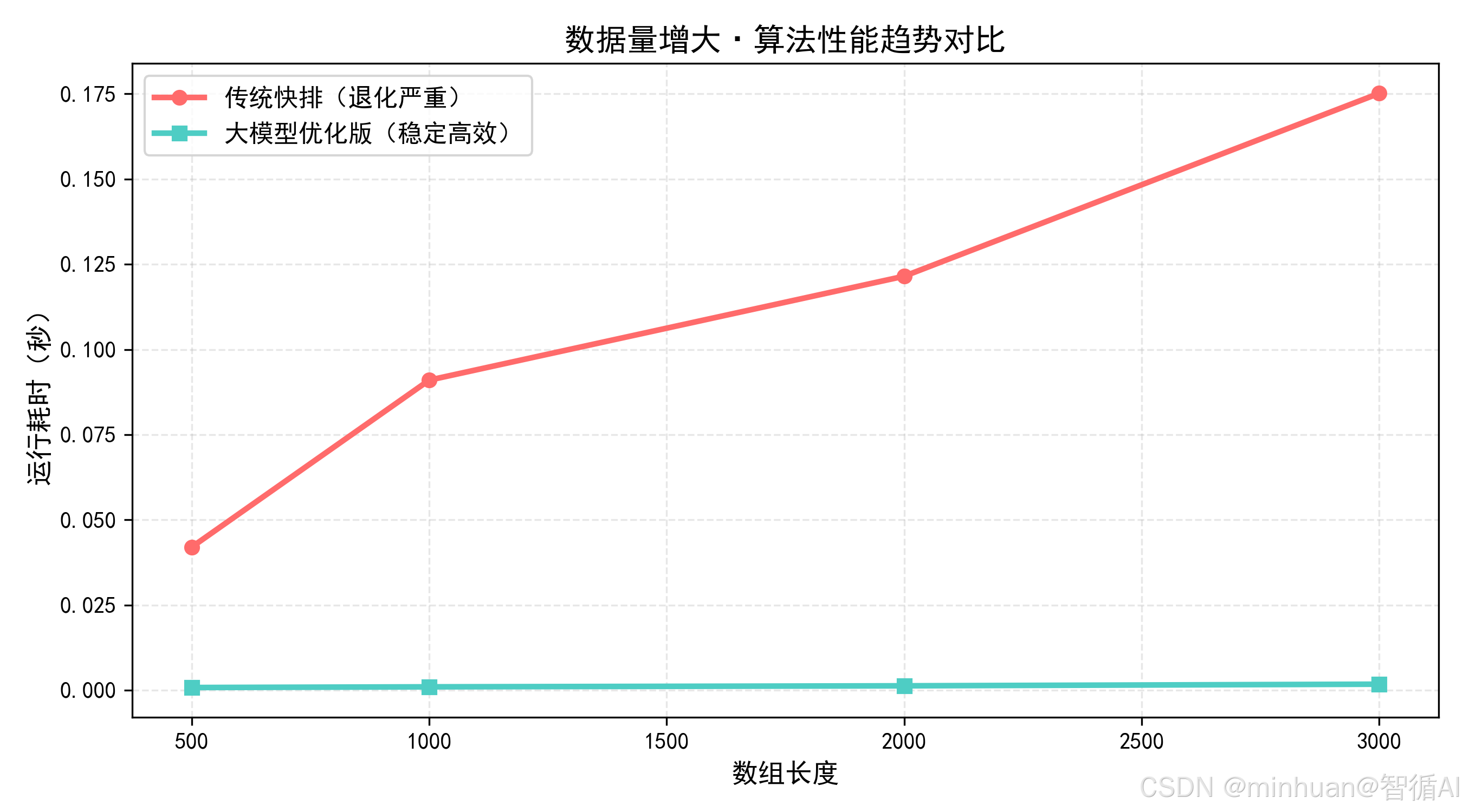 而大模型恰好补齐了这块短板,依托强大的逻辑推理与场景学习能力,自动诊断算法漏洞、溯源问题根源,再通过重构核心逻辑、动态调整参数、优化执行策略,反向迭代升级传统算法。就像本次快速排序的实战案例,原生写法因基准选取缺陷,在有序数据下效率大幅下滑,经过大模型优化后,通过三数取中等轻量化改造,性能实现质的提升,差距直观可见。