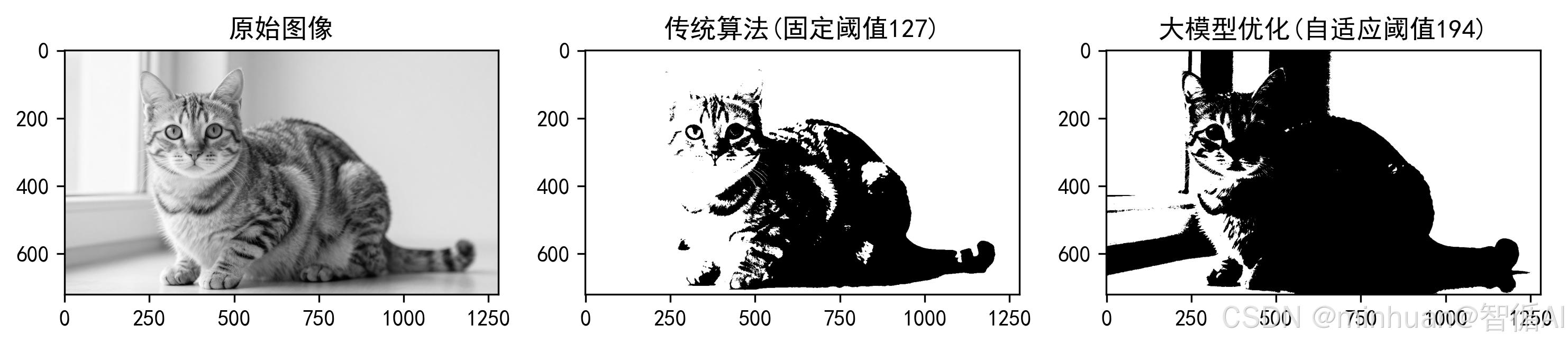 - 例如:针对阈值分割算法,大模型根据图像实时亮度,动态生成50-200之间的自适应阈值,而非固定127。