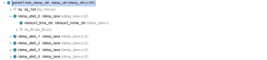 上图为125M时钟域的信号,连接的模块lvds_s2p模块中的hssio ip的IDELAY延时控制端口,使用的是ip输出的125M pll clkout0,在模块内部要跨时钟域使用;
