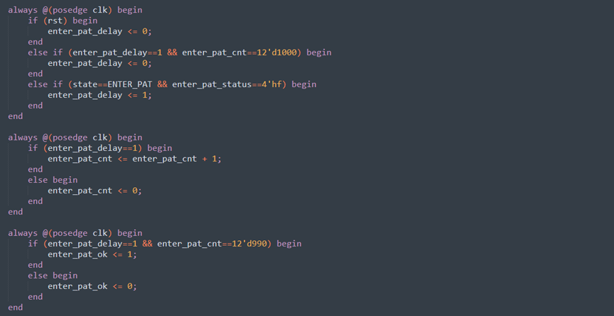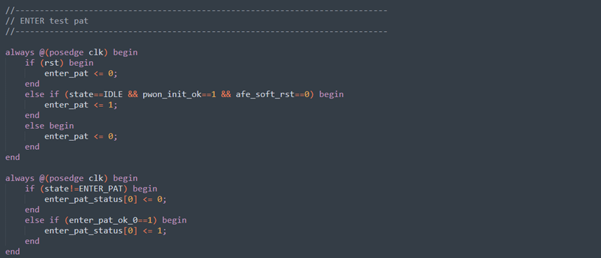 等待所有AFE完成,enter_pat_status[3:0]分别记录各AFE的进入测试模式的状态。当enter_pat_status==4'hf时表示全部进入测试模式,启动enter_pat_delay延迟计数;