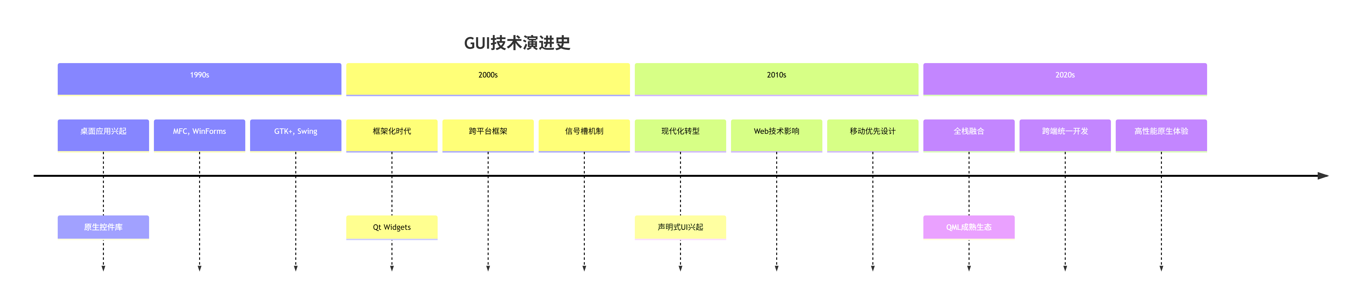 在深入QML之前,让我们先回顾一下GUI开发的演进历程。这将帮助我们理解QML为何而生,以及它解决了哪些核心问题。