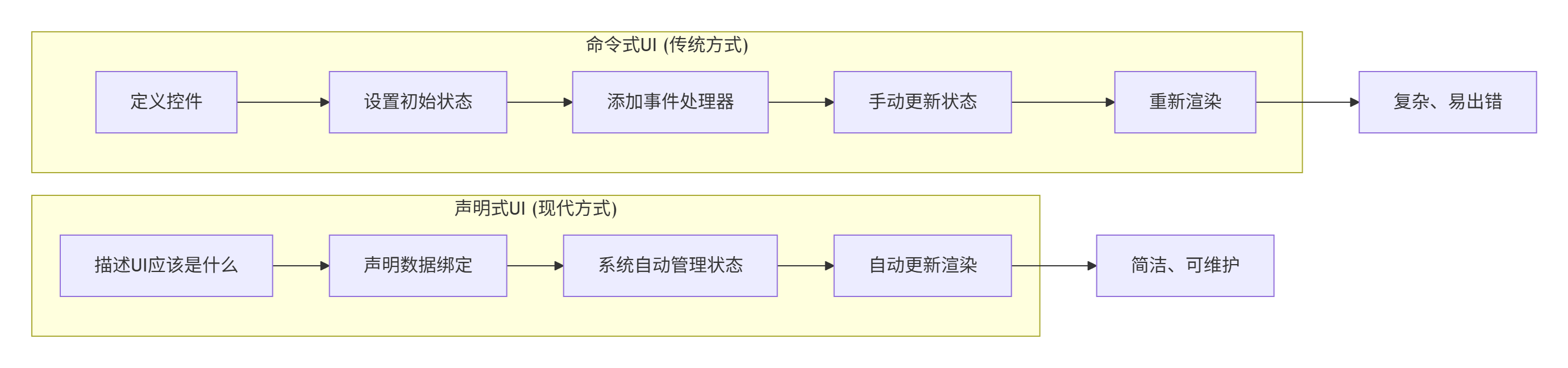 声明式UI范式彻底改变了游戏规则。与其告诉计算机"如何做"(命令式),我们告诉它"做什么"(声明式)。