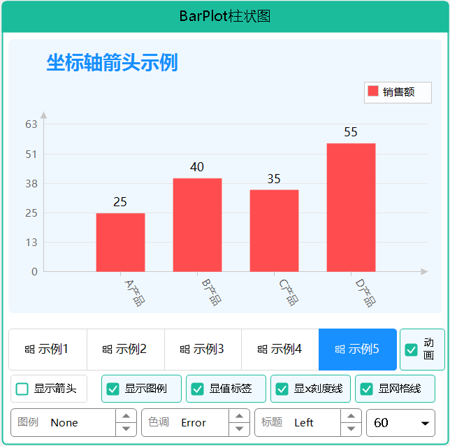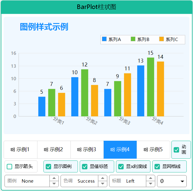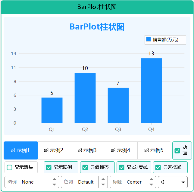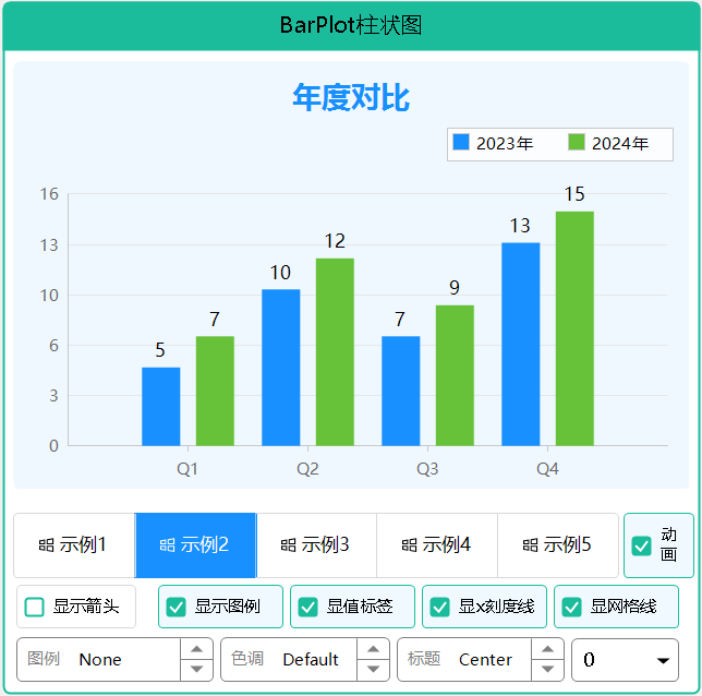 BarPlotEx 是一个功能强大的柱状图控件,参考 ScottPlot 设计,支持亮暗主题切换、色彩模式、值标签显示、对比柱状图、标题设置、坐标轴箭头、网格线样式和图例位置控制。