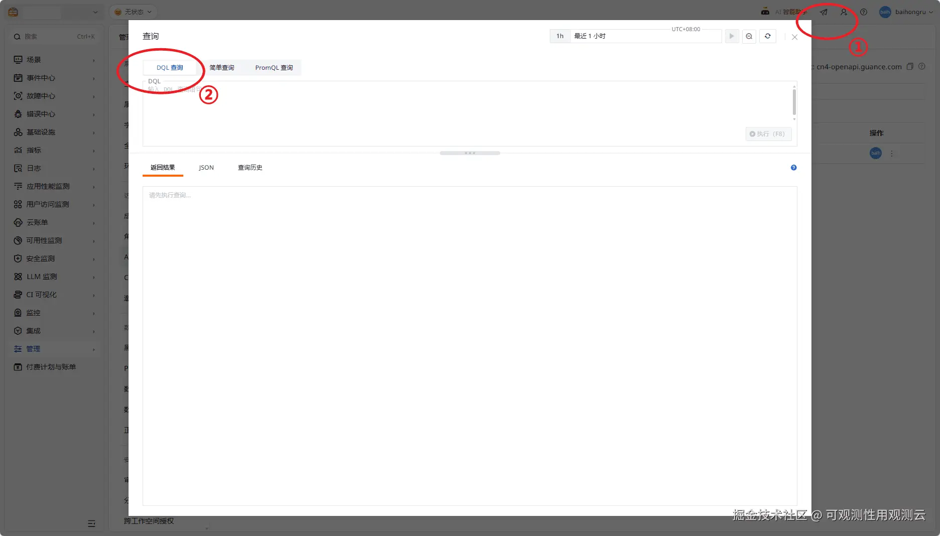 - 调试 DQL:数据查询接口通过传入 DQL 查询语句进行查询,建议在调用接口之前确认查询语句,完整语法请参考 docs.guance.com/dql/ ,可以在观测云界面的查询工具中进行调试,点击快捷方式 -【查询工具】,选择 DQL 查询模式,支持语法校验和自动补全: