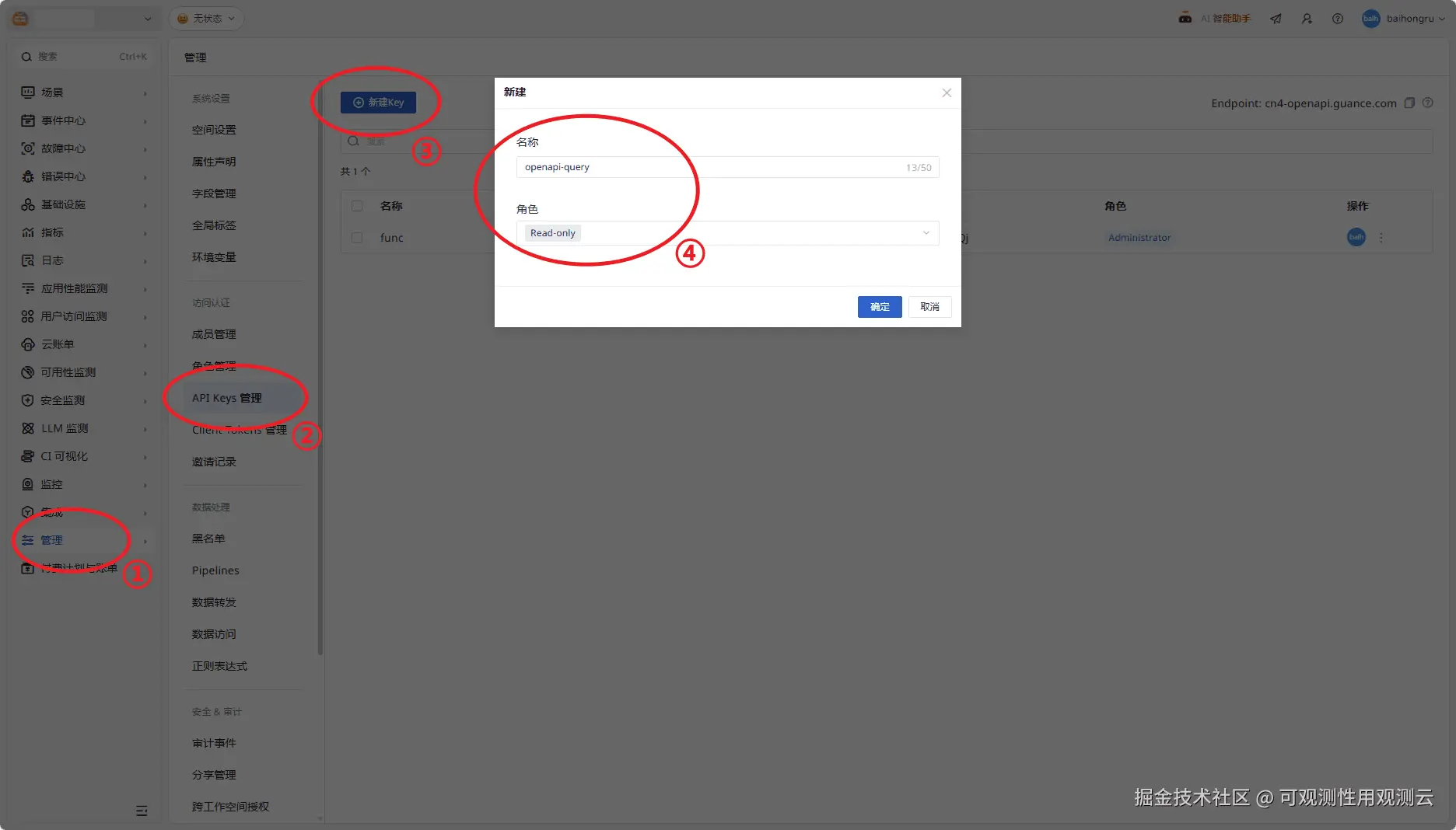 - 创建 API Key:确保登录用户有所需的操作权限。登录观测云控制台,点击【管理】-【API Keys 管理】-【新建 Key】,填写名称与角色,本实践仅使用数据查询接口,因此使用内置角色 "Read-only"。