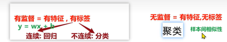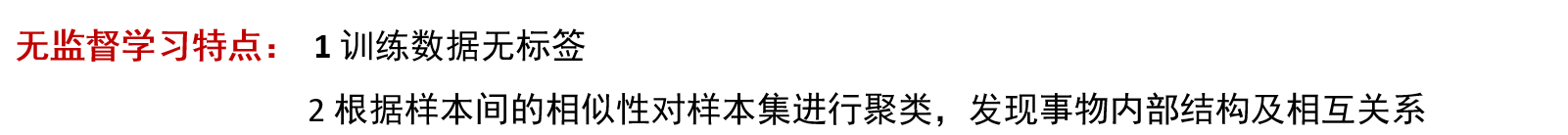 无监督学习:输入数据没有被标记,即样本数据类别未知,没有标签,根据样本间的相似性,对样本集聚类,以发现事物内部结构及相互关系。