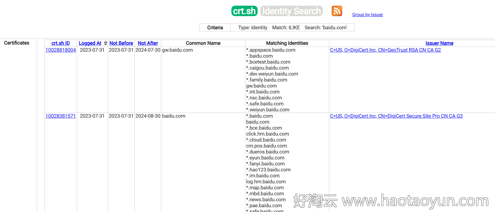注:仅限 HTTPS 网站。可以通过 crt.sh 等在线证书搜索引擎,输入目标域名查询其关联的子域名。