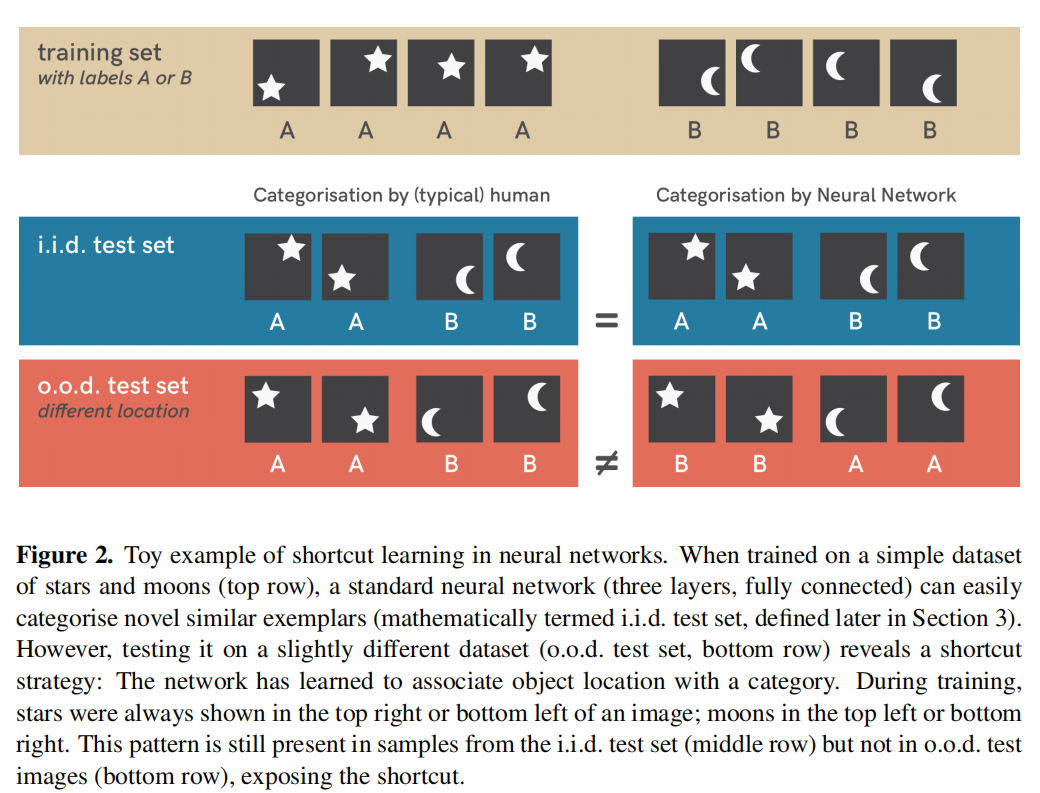 第一行是训练集,只有星星和月亮,星星的标签是A,月亮的标签是B,从人类的视觉判断来看,星星和月亮的重要区分点是形状,但是在训练集中,星星总是出现在图片的左下角和右上角,月亮总是出现在图片的左上角和右下角,于是CNN在学习的过程中出现了shortcut learning,简单粗暴的将目标类别和位置关联在了一起。当测试集是蓝色是,测试集和训练集是独立同分布,测试集准确率很高,当测试集是红色时,测试集合训练集不在时独立同分布的,星星出现在了月亮常出现的左上和右下,月亮出现在了星星常出现的左下和右上,所有出现了,在红色测试集中,CNN预测完全错误的情况。