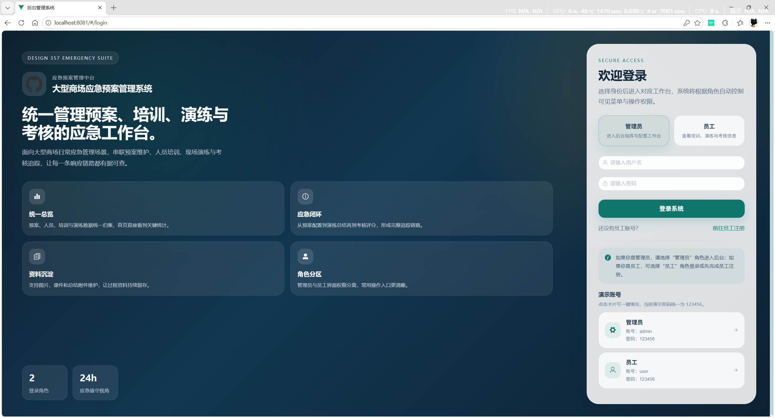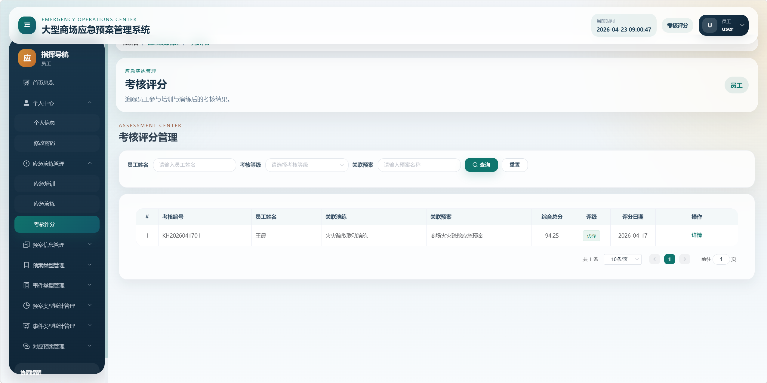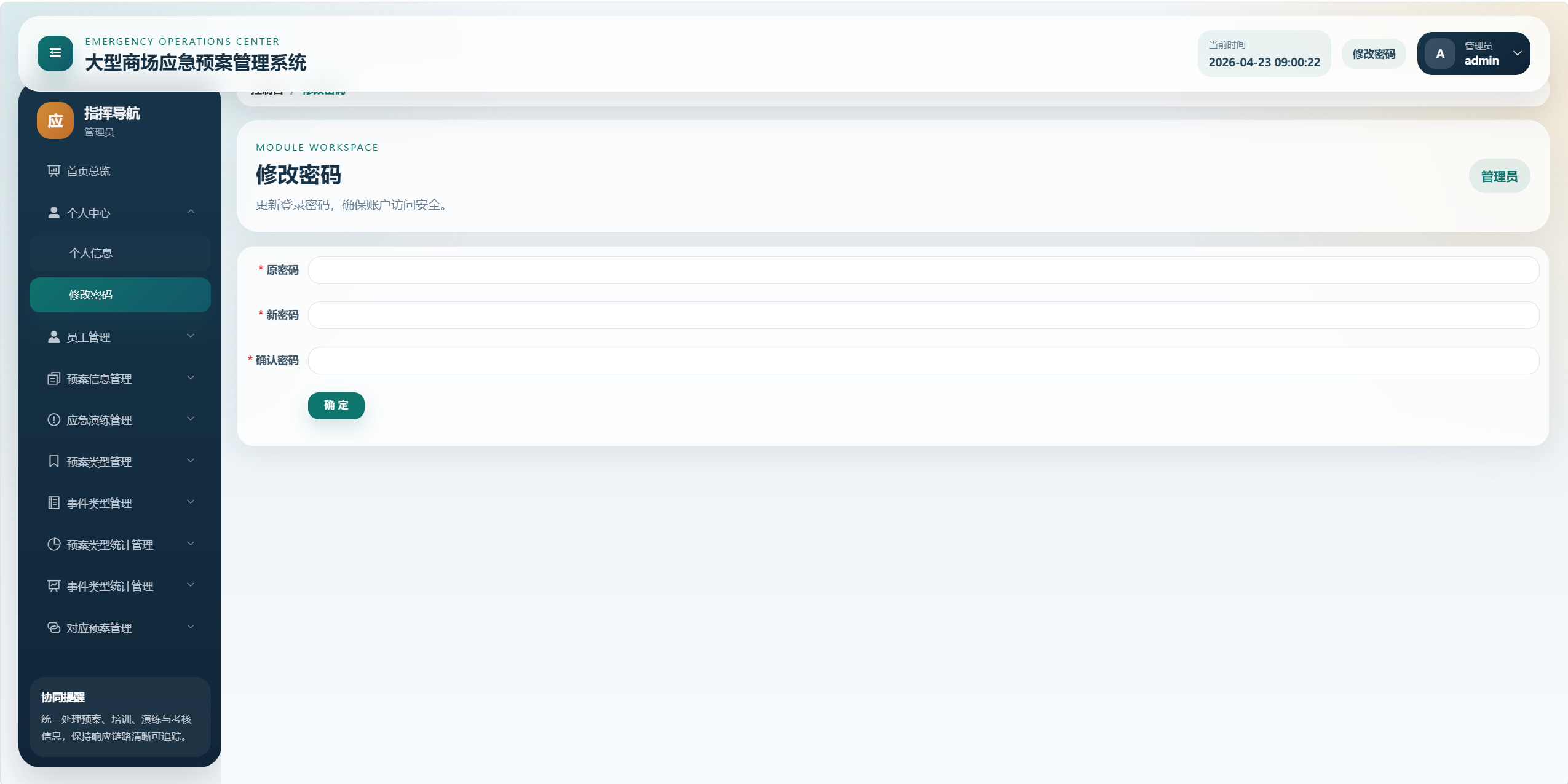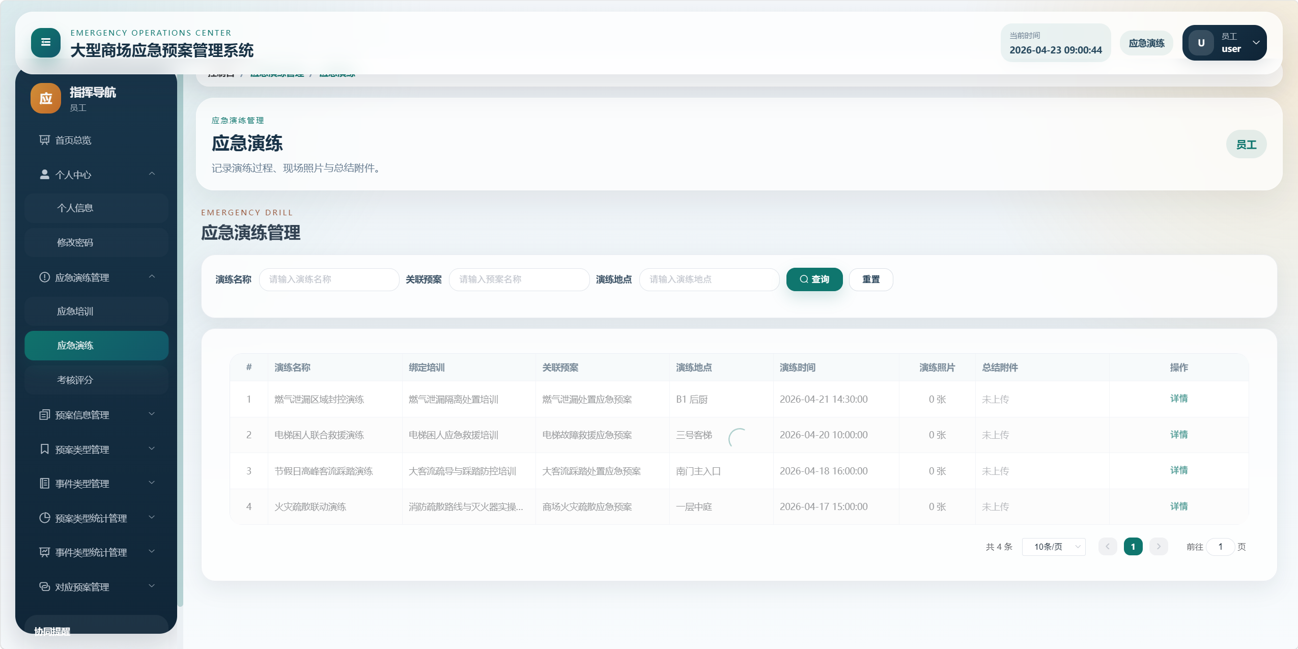 - 员工:可登录后台查看预案、培训、演练、考核和统计信息,部分模块仅具备查看权限。