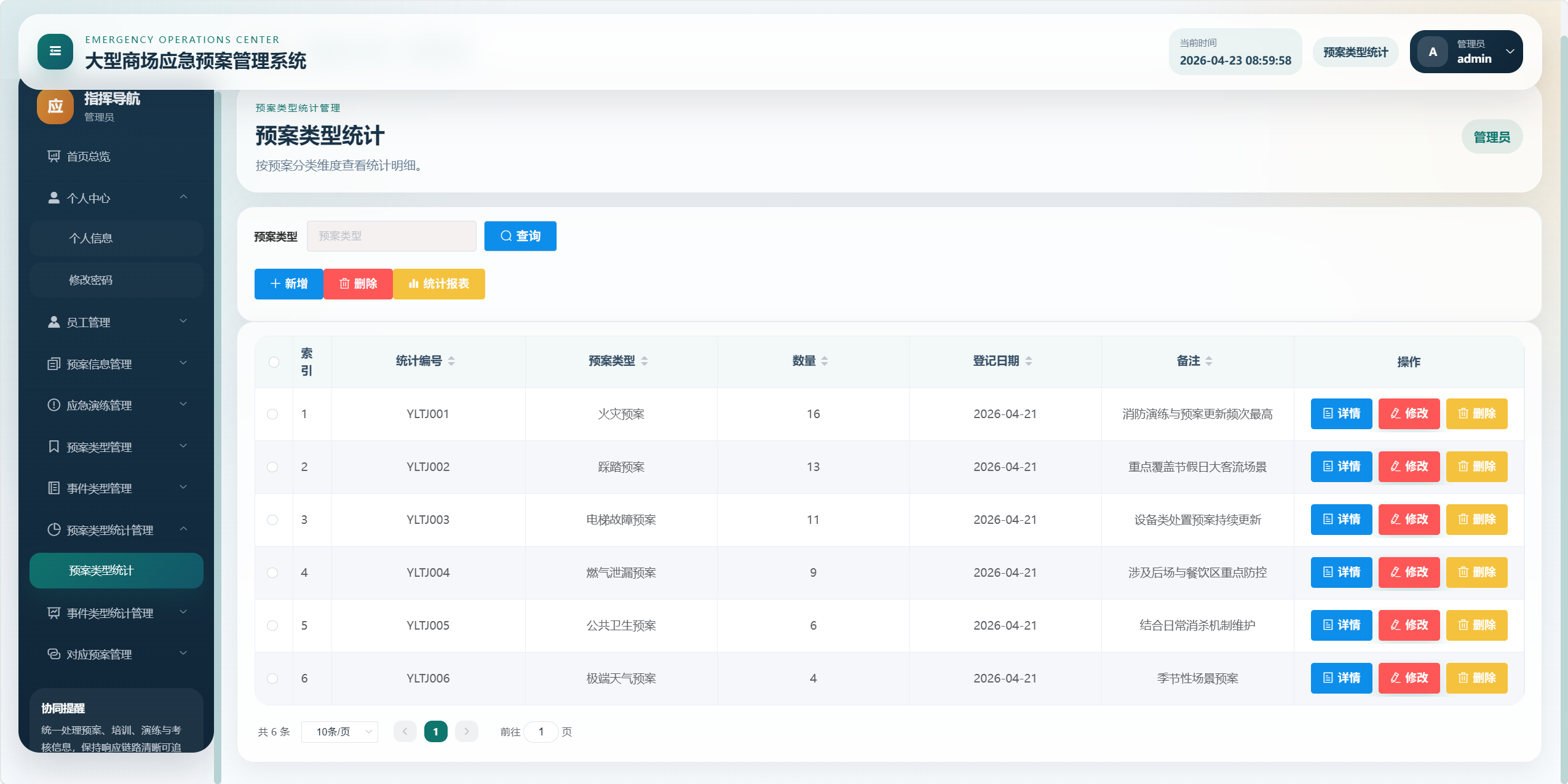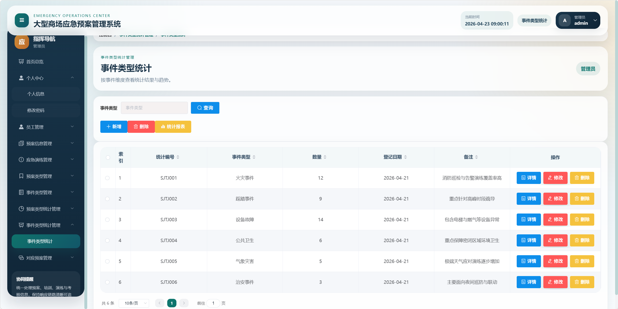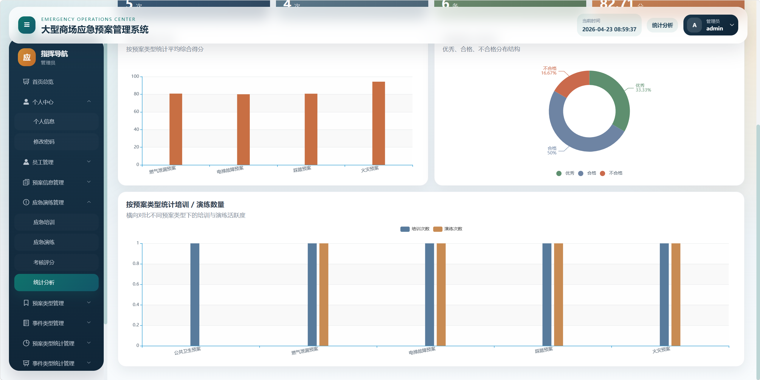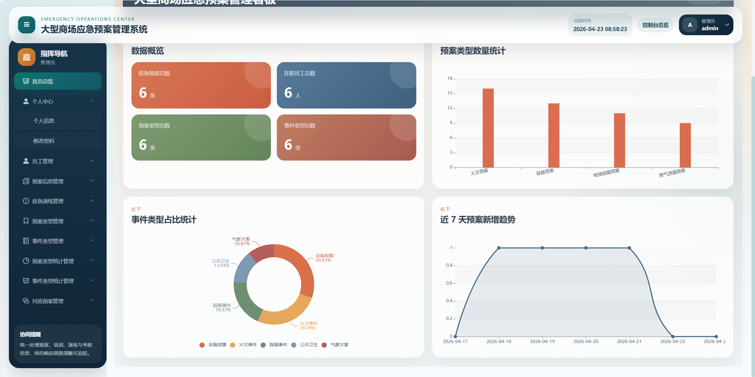 本项目是一个面向大型商场应急管理场景的后台管理系统,核心目标是将"应急预案、事件类型、预案类型、应急培训、应急演练、考核评分、统计分析、对应预案"等业务统一管理起来,形成从预案维护到培训演练、再到考核评价和数据看板的闭环。
