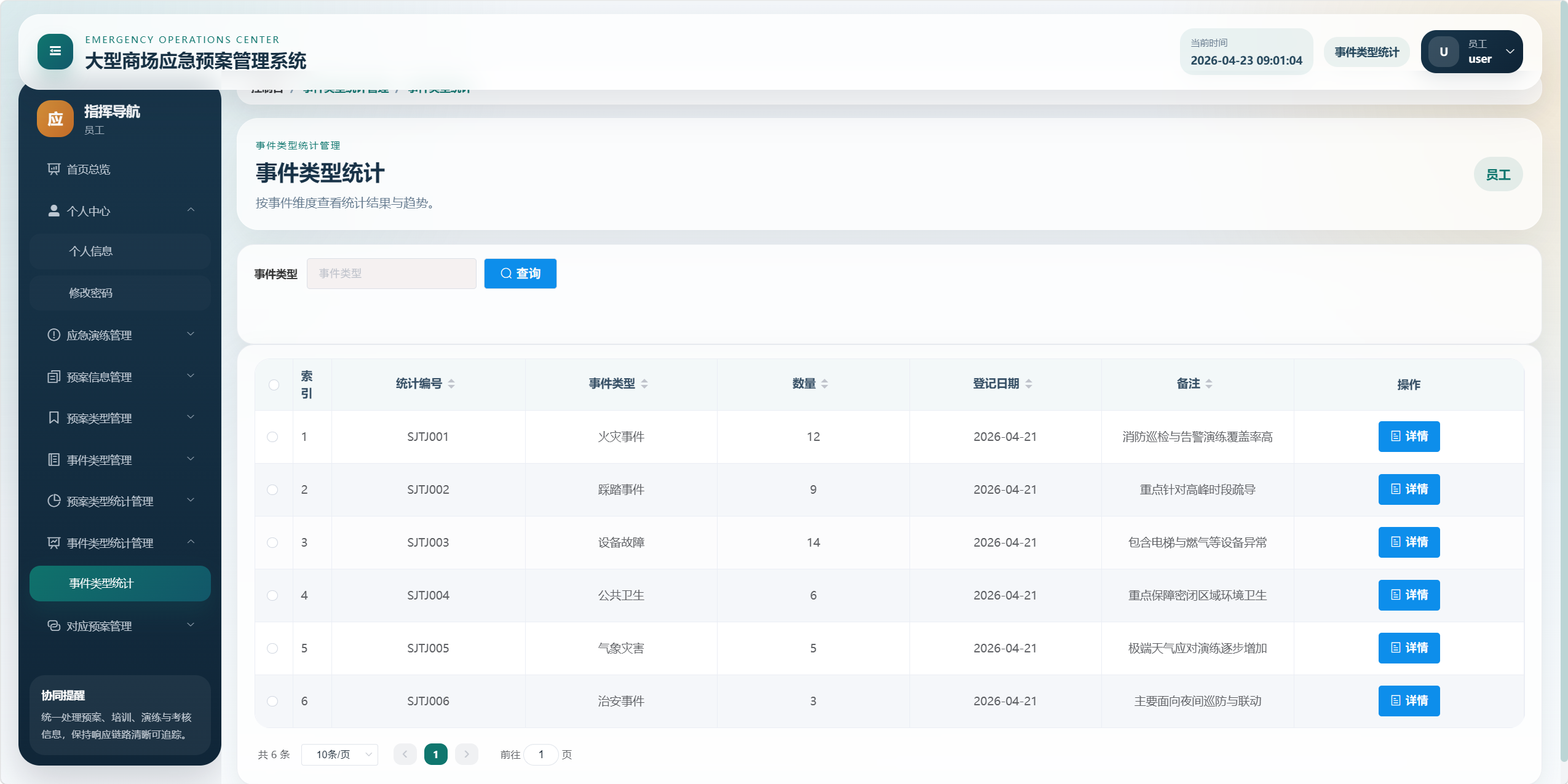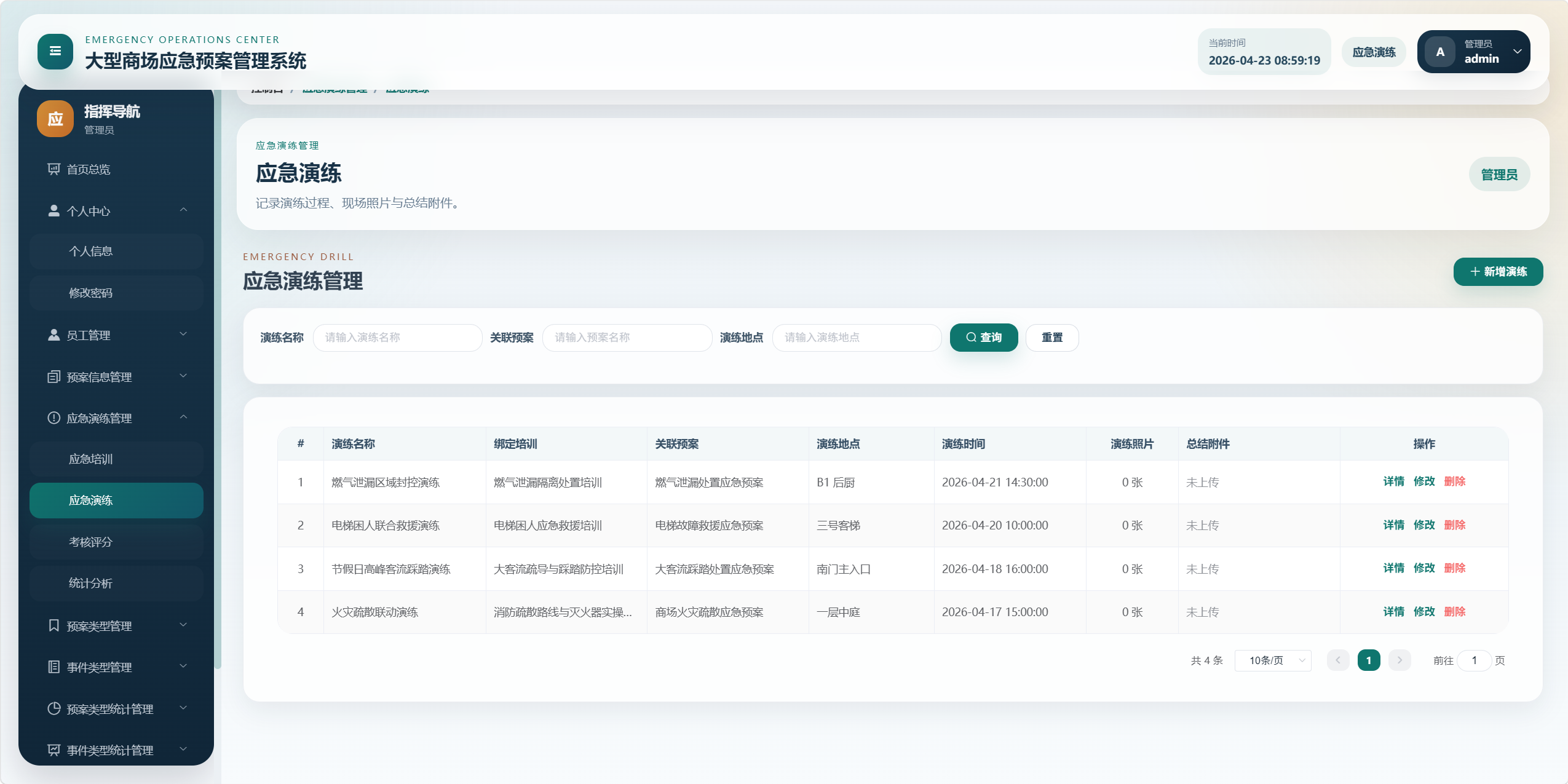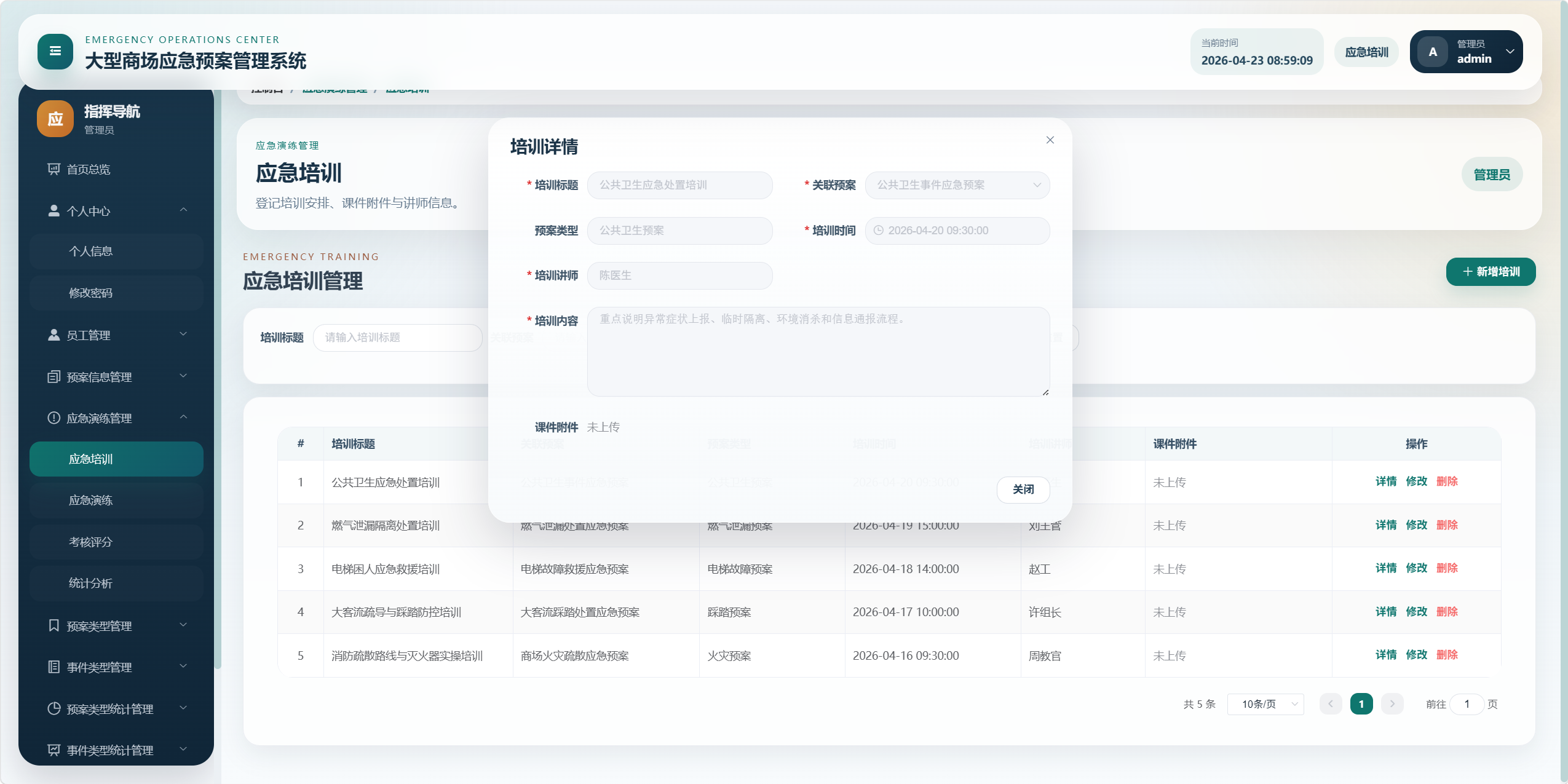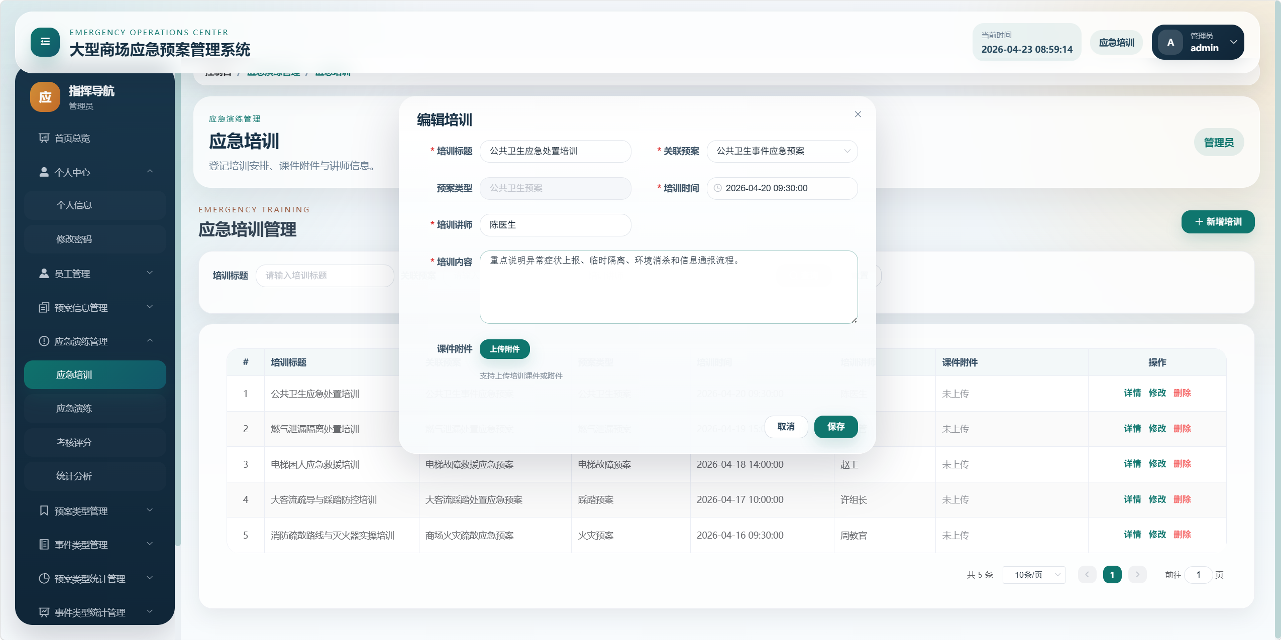 本项目是一个面向大型商场应急管理场景的后台管理系统,核心目标是将"应急预案、事件类型、预案类型、应急培训、应急演练、考核评分、统计分析、对应预案"等业务统一管理起来,形成从预案维护到培训演练、再到考核评价和数据看板的闭环。