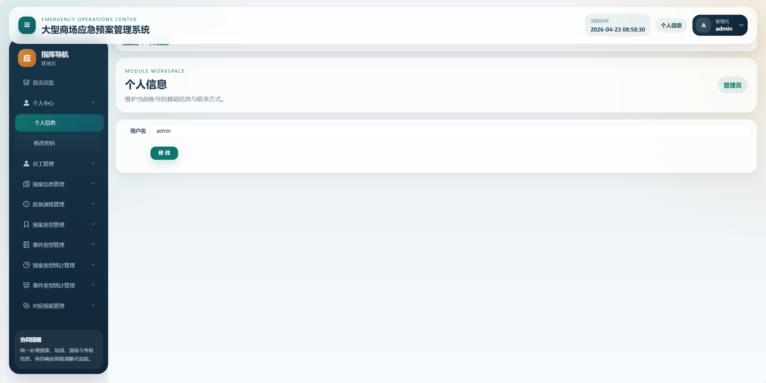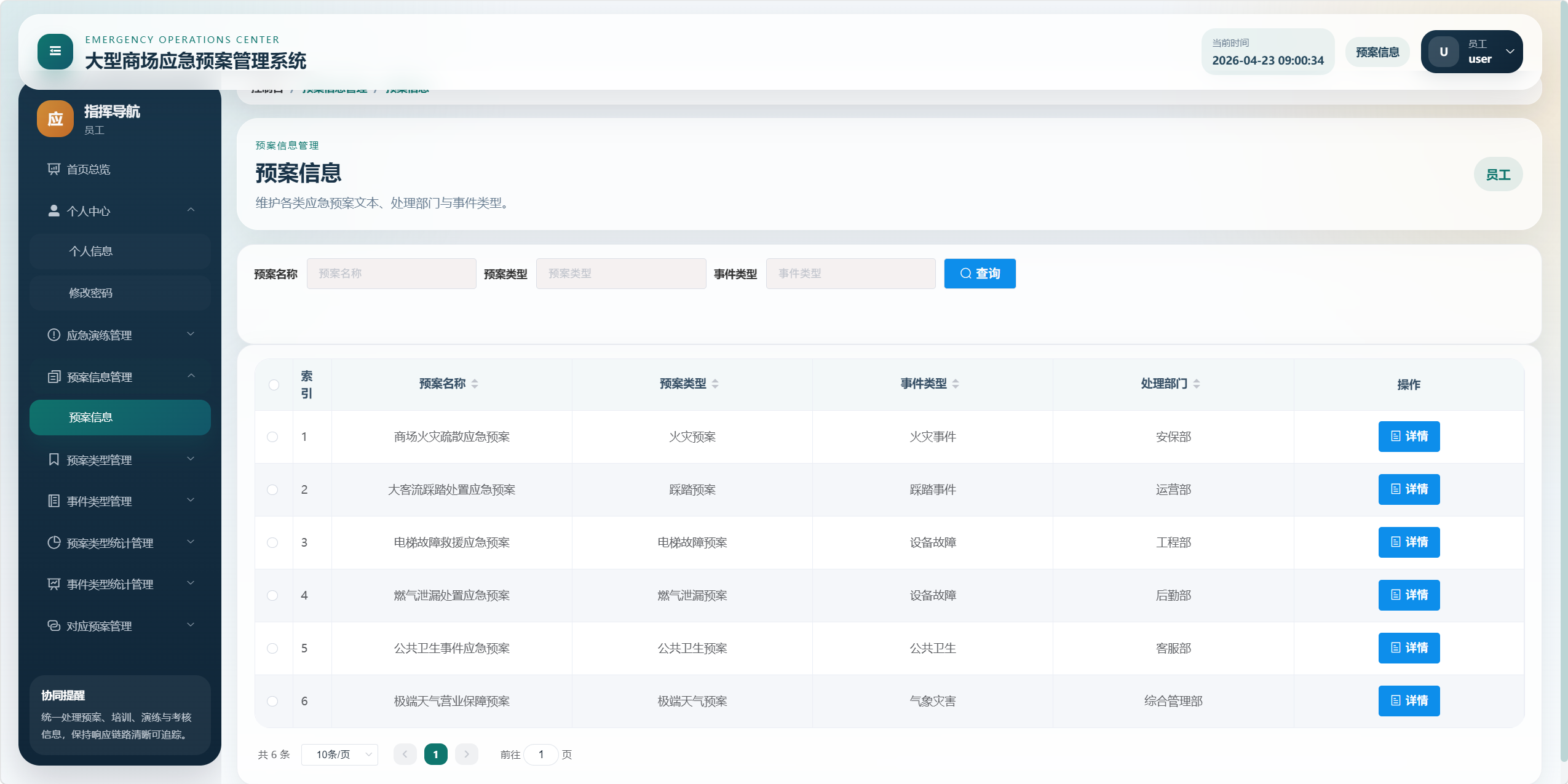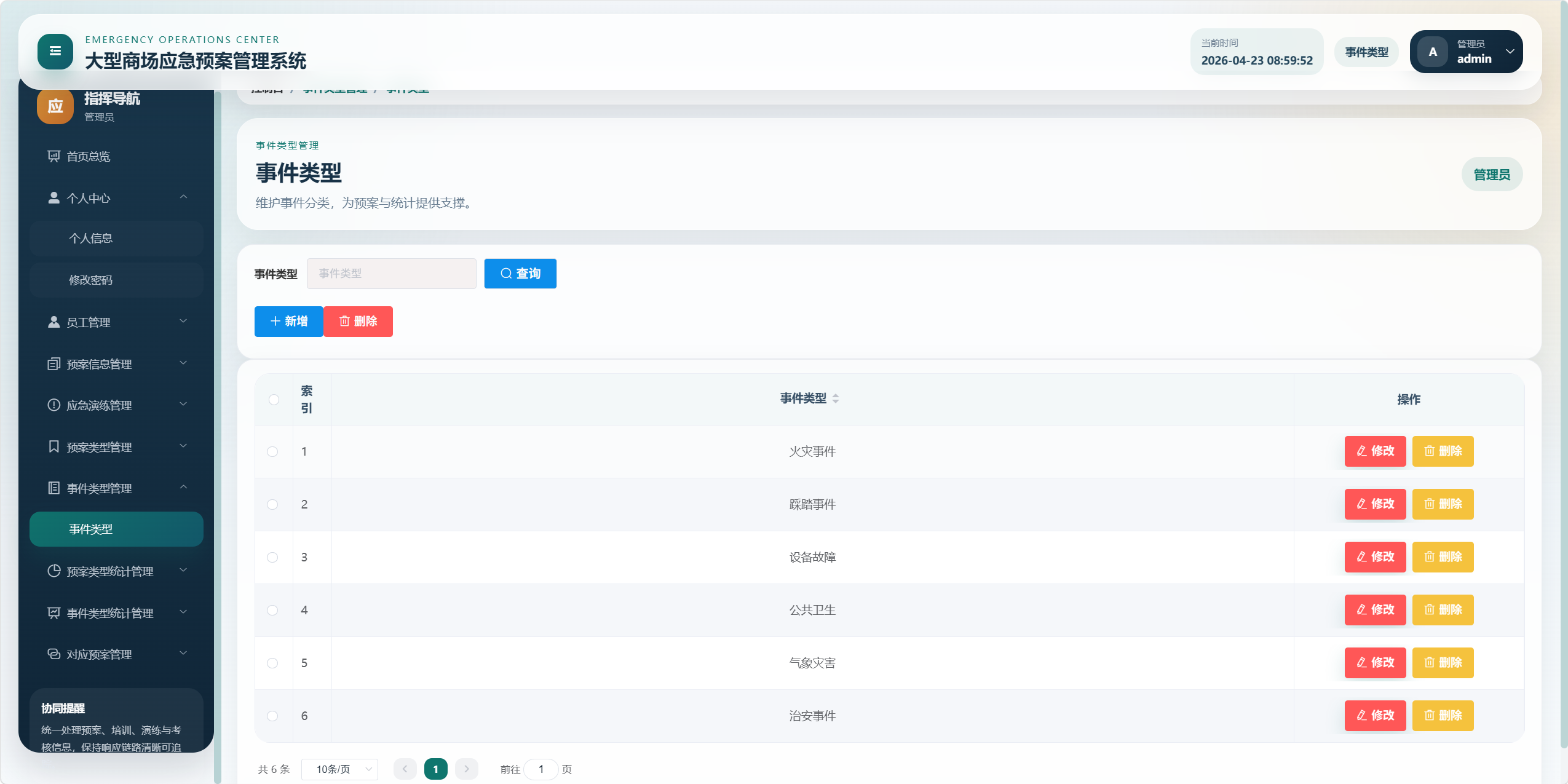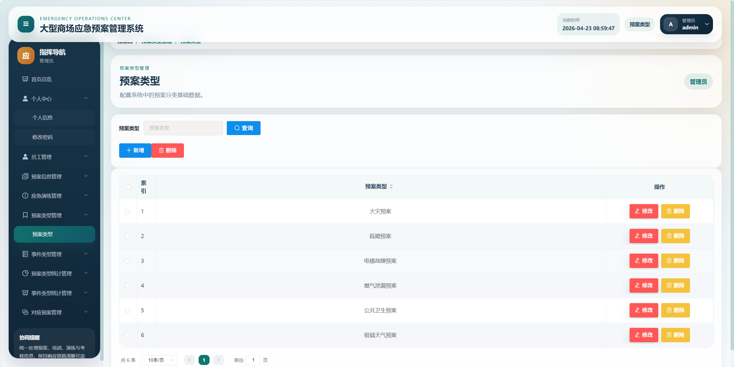 本项目是一个面向大型商场应急管理场景的后台管理系统,核心目标是将"应急预案、事件类型、预案类型、应急培训、应急演练、考核评分、统计分析、对应预案"等业务统一管理起来,形成从预案维护到培训演练、再到考核评价和数据看板的闭环。