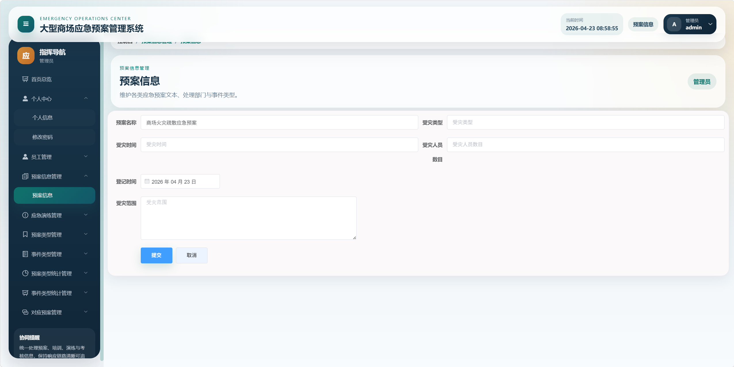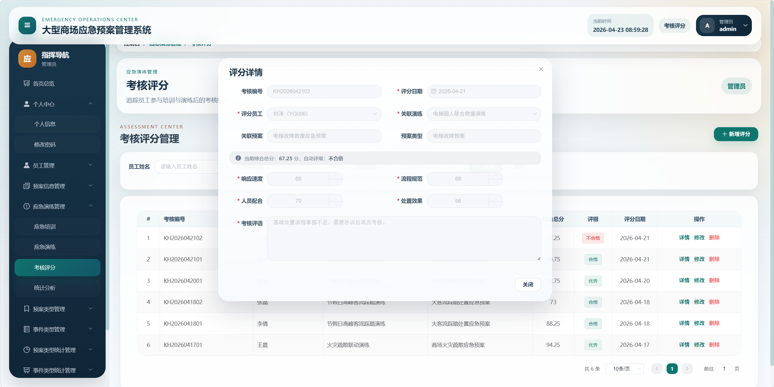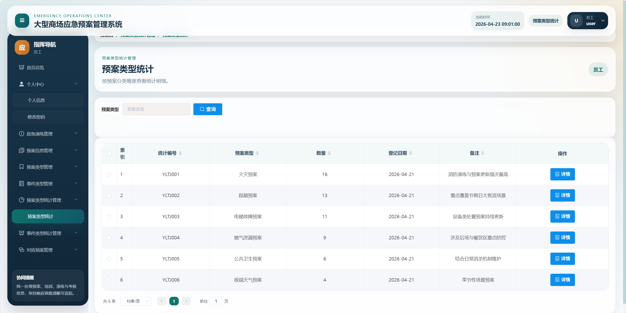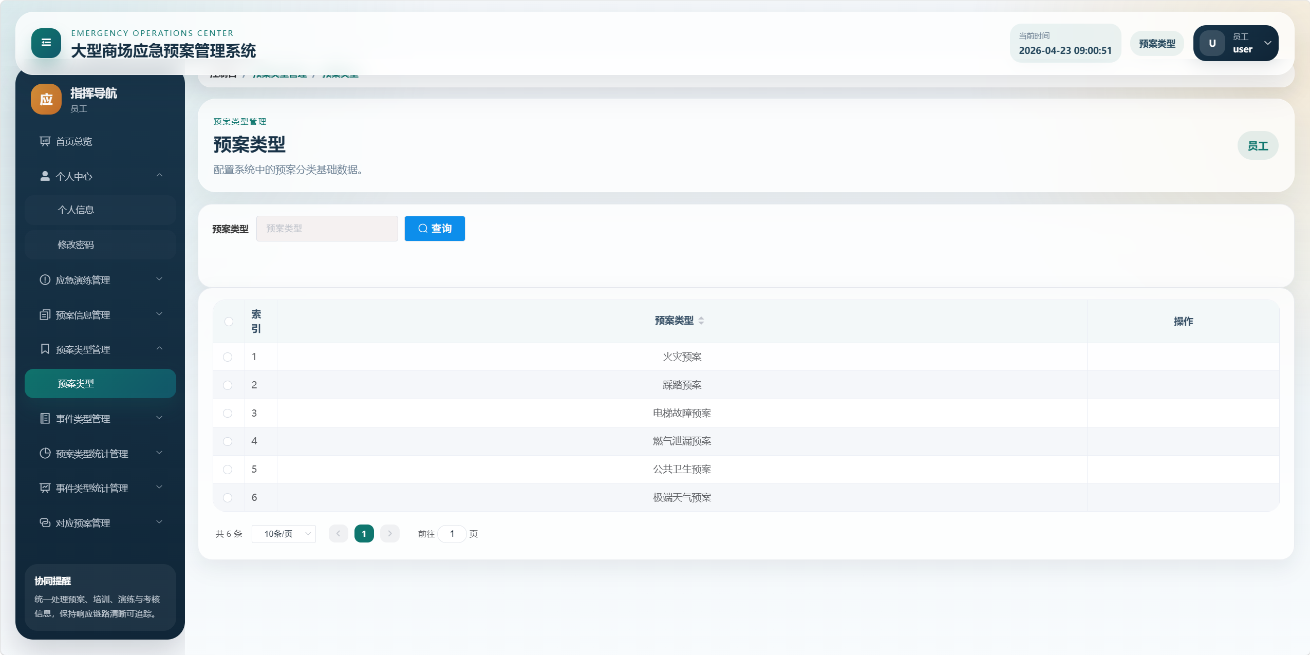 本项目是一个面向大型商场应急管理场景的后台管理系统,核心目标是将"应急预案、事件类型、预案类型、应急培训、应急演练、考核评分、统计分析、对应预案"等业务统一管理起来,形成从预案维护到培训演练、再到考核评价和数据看板的闭环。