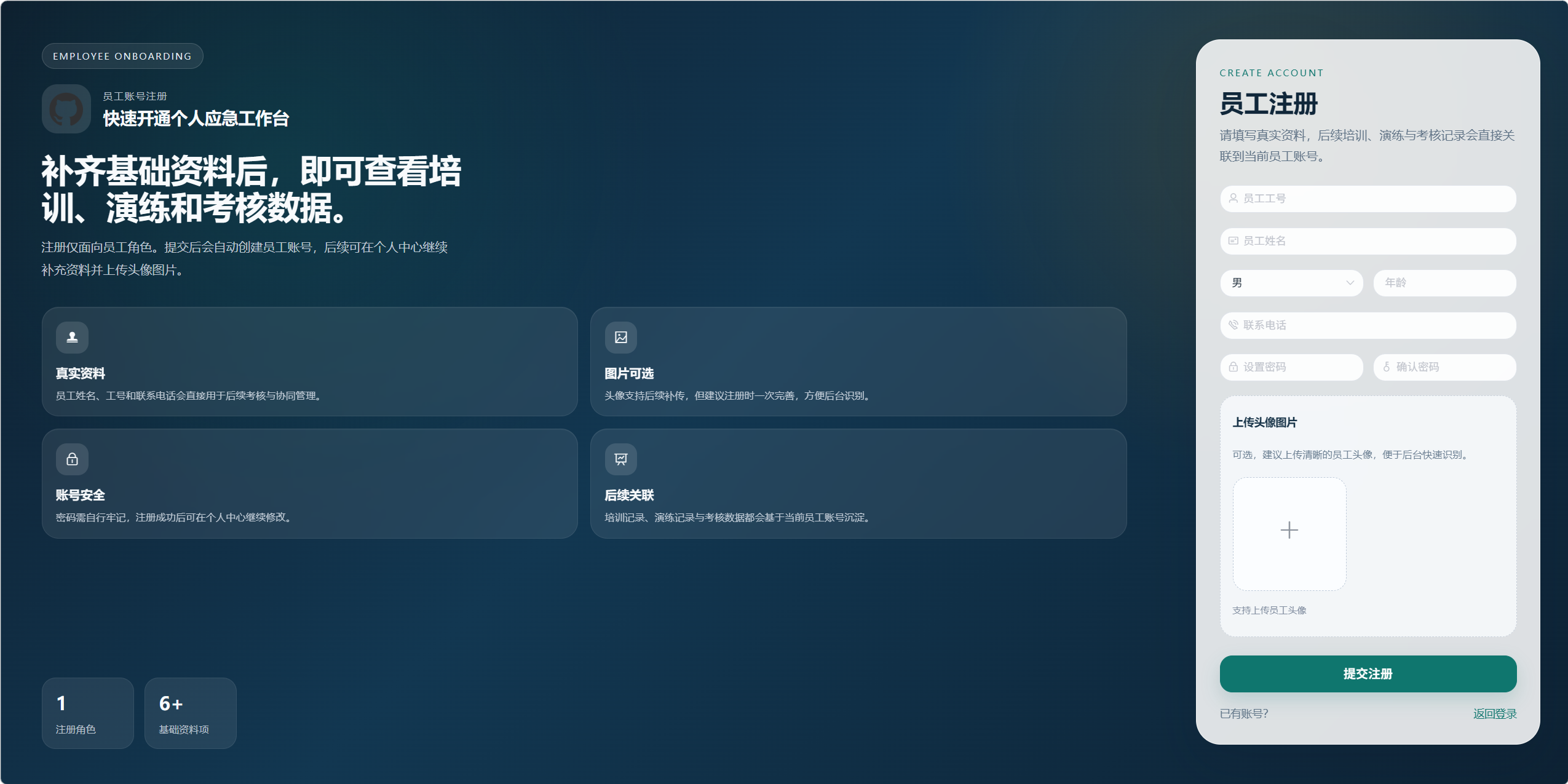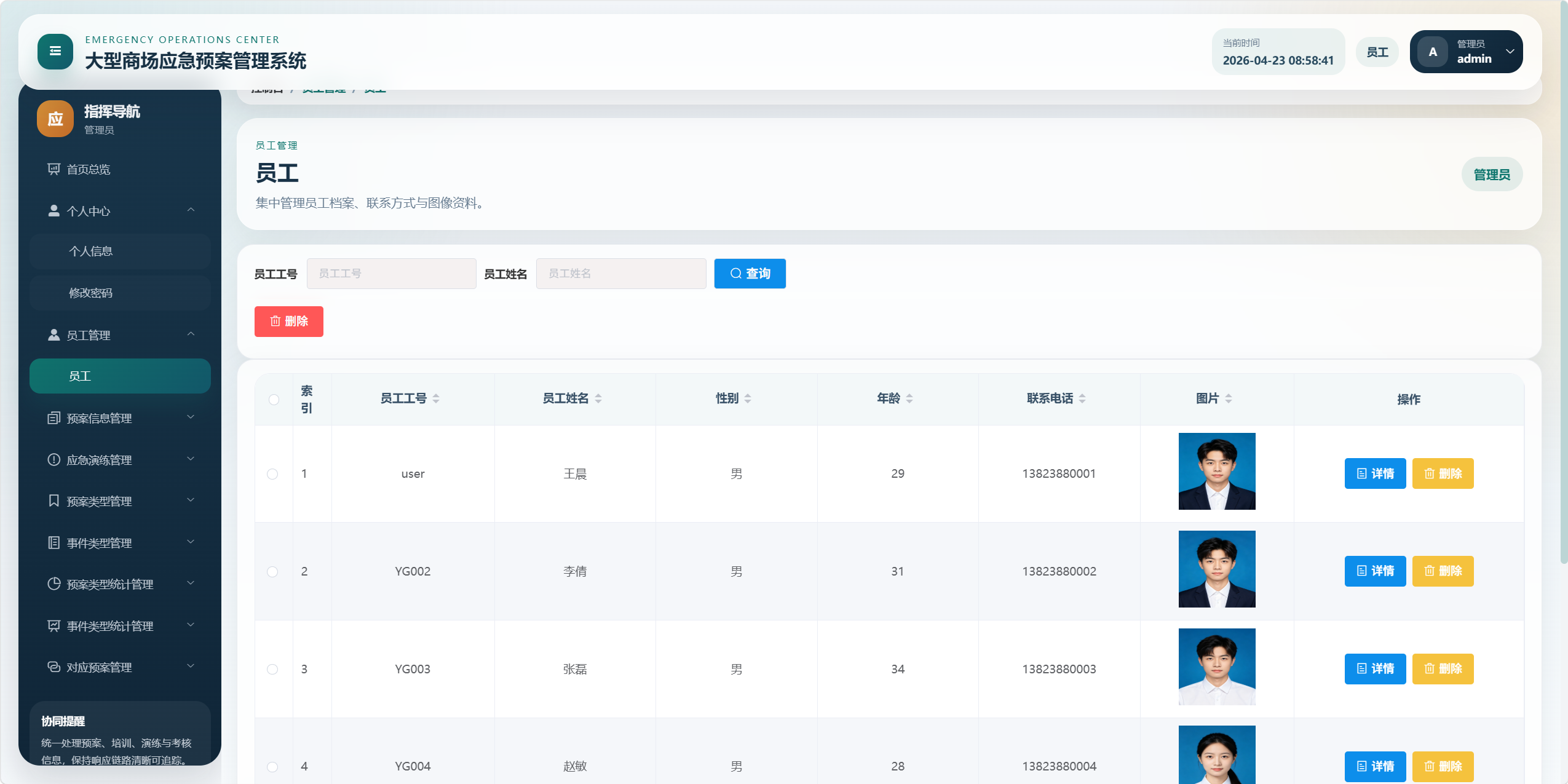- 管理员:拥有后台管理能力,可维护员工、预案、培训、演练、考核、统计、类型字典等数据。