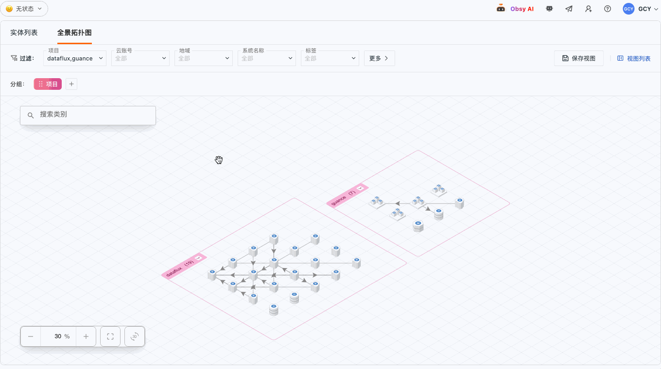 - 全景架构拓扑 :自动生成工作空间全景架构图,支持多维度筛选、分组展示(最多 5 层嵌套)及视图保存