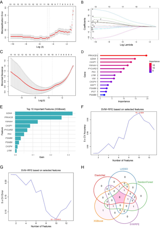 接下来,作者进一步采用LASSO、ElasticNet、Random Forest、XGBoost和SVM-RFE五种机器学习方法进行交叉筛选,最终稳定获得6个hub genes:YWHAH、PRKACB、PSMB9、FAS、GZMA和CASP1。这些基因被认为代表了DKD中PANoptosis调控网络中的关键节点。