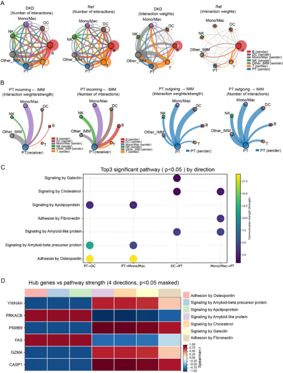 更进一步,作者聚焦近端小管(PT)与主要免疫细胞亚群之间的细胞通讯。结果显示,DKD 中整体的通讯数量和强度均增加,不仅体现在免疫细胞之间,也体现在肾小管与免疫细胞之间的双向互作增强。其中,PT--Mono/Mac 和 PT--DC 之间的信号交流尤为突出。相关信号通路包括 apolipoprotein、osteopontin、amyloid-beta precursor protein、galectin 及 fibronectin 等,揭示 ECM 黏附和代谢/凝集素相关信号可能是 DKD 中免疫-小管对话的重要特征。hub genes 的表达还与这些通讯通路强度呈方向依赖性的相关,进一步将 PANoptosis 关键节点与肾小管-免疫细胞网络联系起来。