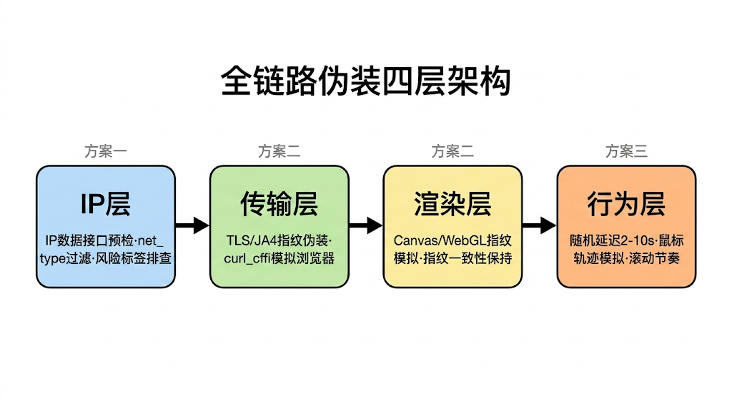 全链路伪装四层架构,IP层传输层渲染层行为层,对应IP预检、TLS伪装、指纹模拟、行为随机