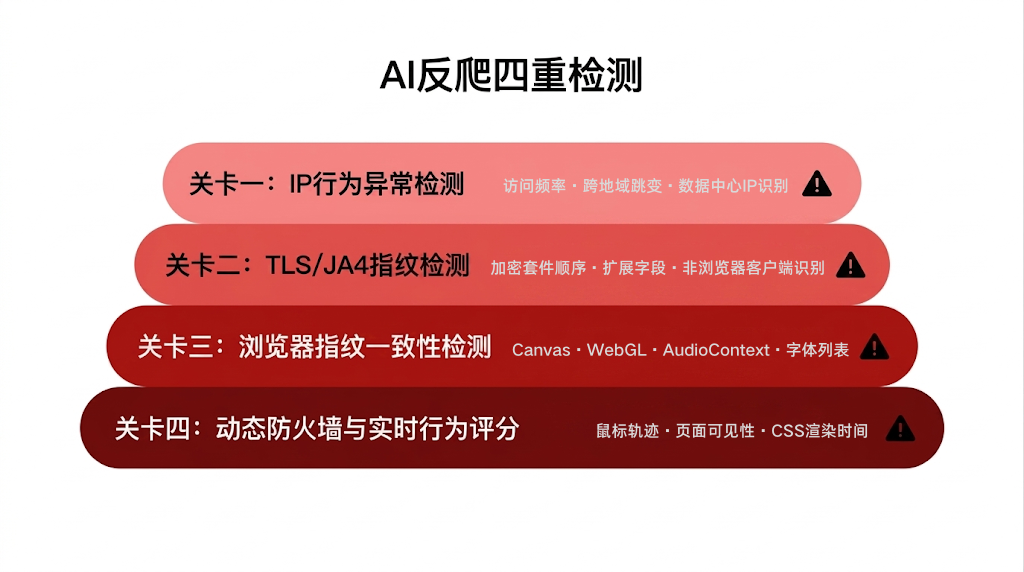 当反爬系统全面AI化,IP行为异常、数据中心IP被监控、浏览器指纹不一致、动态防火墙等四重关卡,让传统方案寸步难行。本文将从AI反爬的检测原理出发,拆解从"只换IP"到"全链路伪装"的升级方案。
