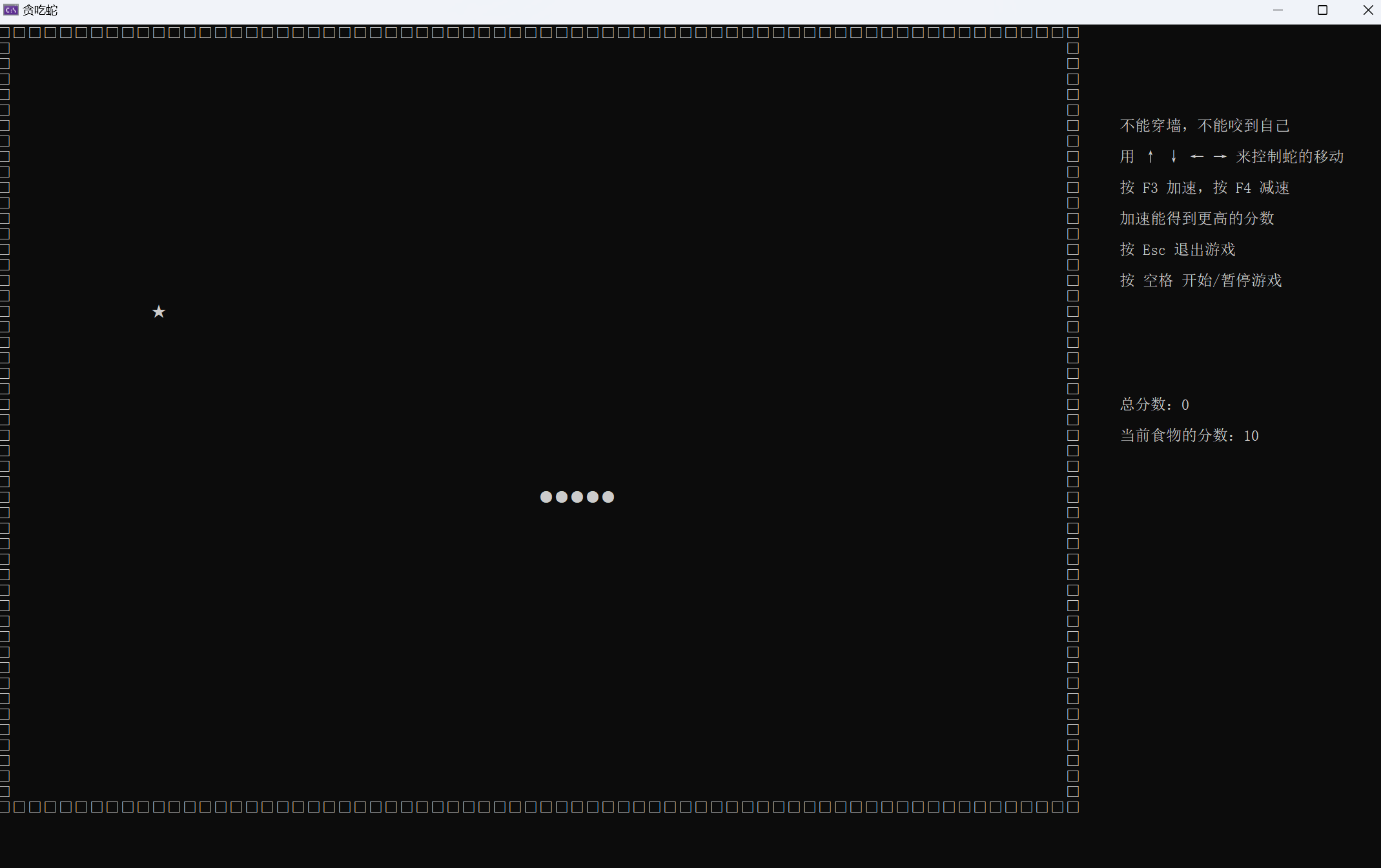 本贪吃蛇游戏基于C语言开发,采用控制台窗口作为游戏界面,通过键盘方向 键控制蛇的移动,蛇吃到随机生成的食物后身体增长、分数增加 ,若蛇头触碰墙壁或自身身体则游戏结束 ,整体通过循环刷新界面 、坐标控制 、按键检测实现经典贪吃蛇的核心玩法,代码简洁易懂,适合 C 语言初学者学习图形控制、逻辑判断和简单游戏开发