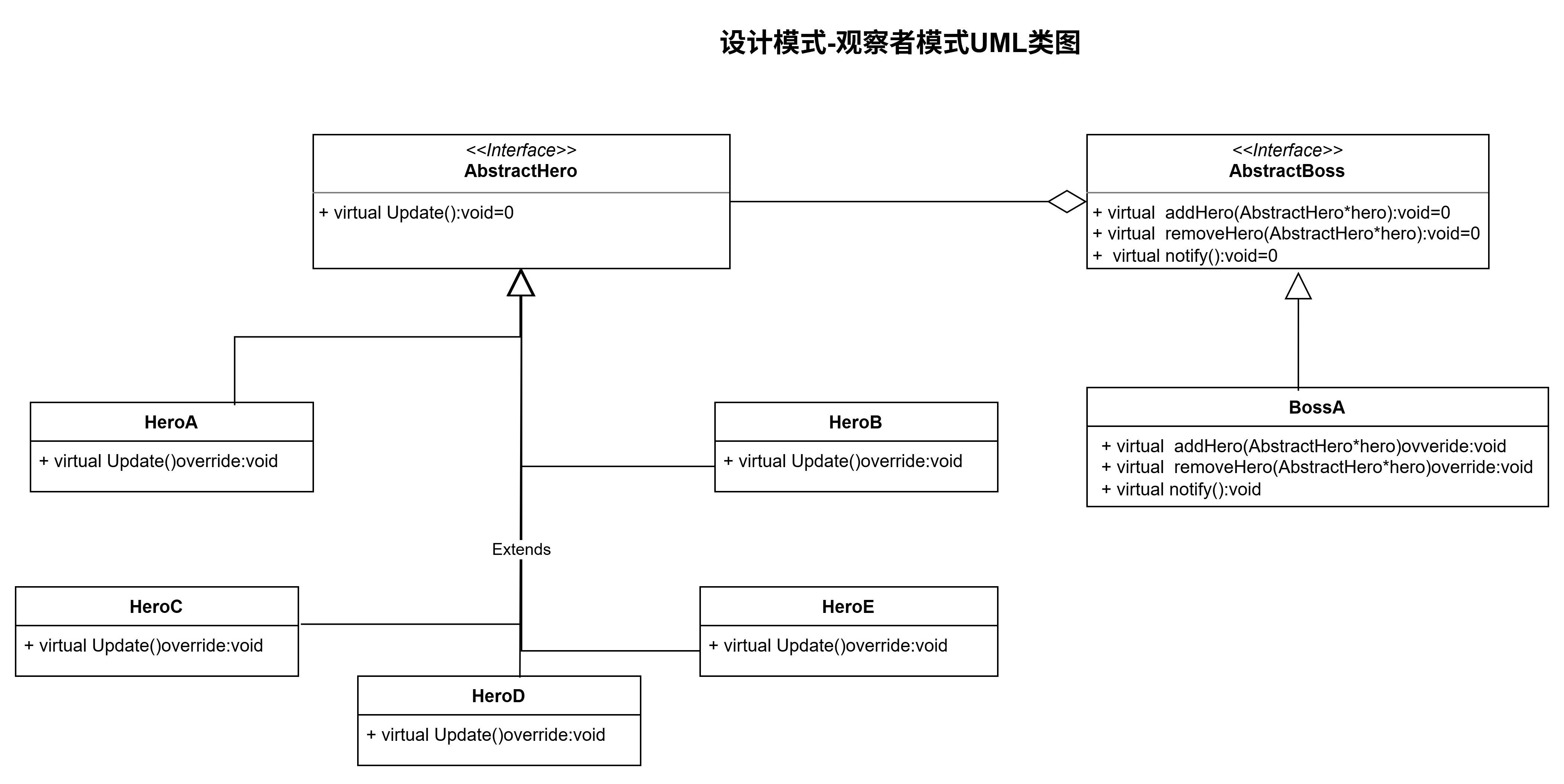 模拟游戏世界中,英雄组团打boss的场景,可以通过观察者模式实现,具体UML类图如下: