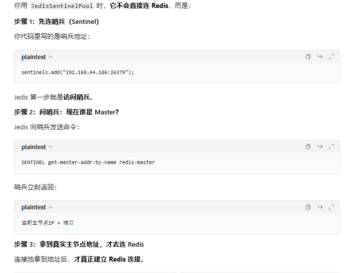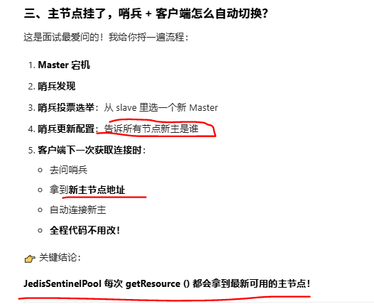 Redis 哨兵集群 | 自动从哨兵节点获取主节点地址,实现主从切换 |