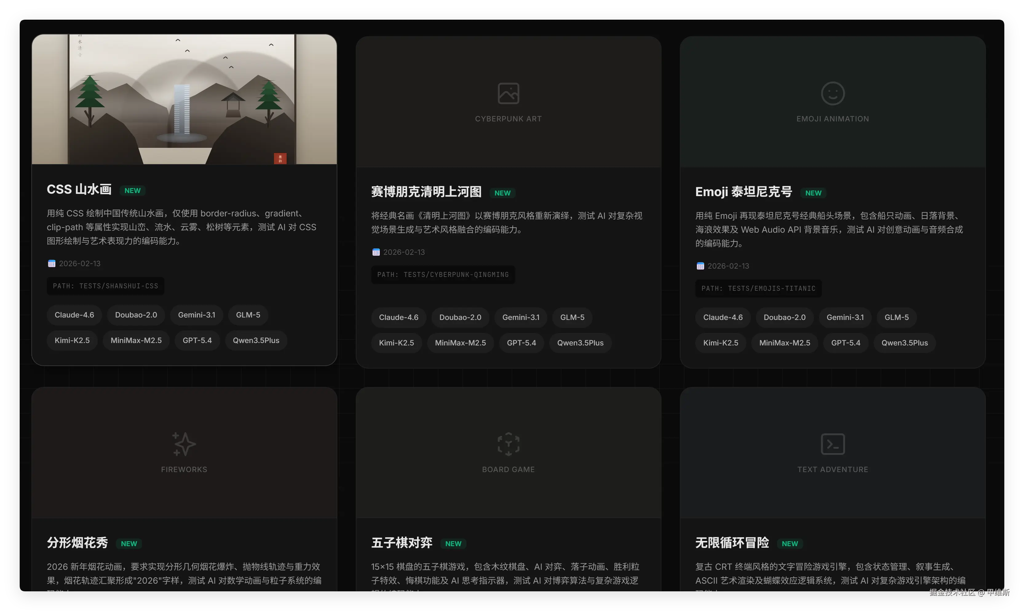 测试例子来自于之前 GLM5 和 Opus4.6 大战的时候。其中五个题目是 GLM 出的,用来挑战 Opus4.6。另外五个例子是 Opus4.6 出的,用来捍卫自己的地位。