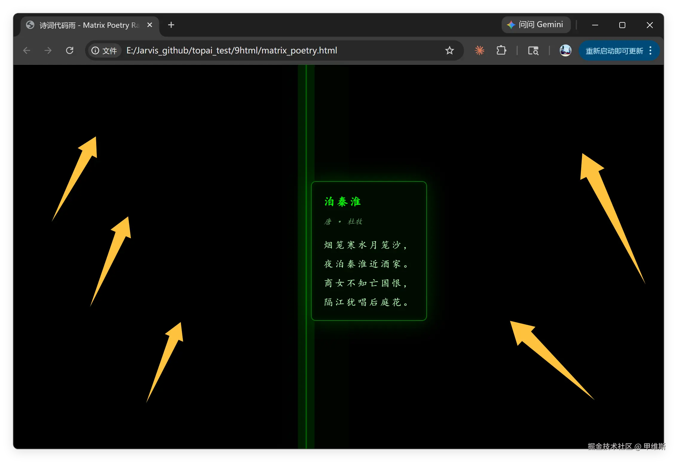 - 下落的不是随机字符,而是中国古诗词(每列是一首完整的诗,从上往下逐字飘落)