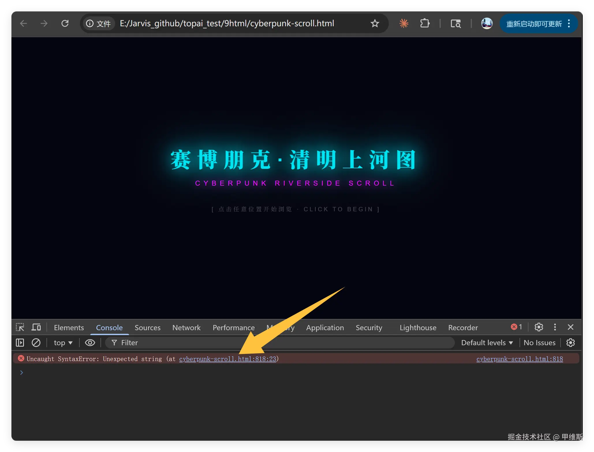 这个时候我基本上断定,肯定是 JS 出错了。所以我把开发者模式打开看了一下控制台。
