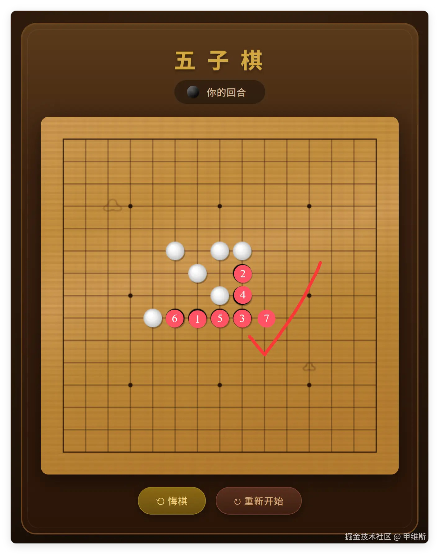 这个界面设计得还是非常不错的,提示词中的需求也全部完成了。AI 的智商也还可以,下了很久,好不容易赢了它,一不小心就容易输。