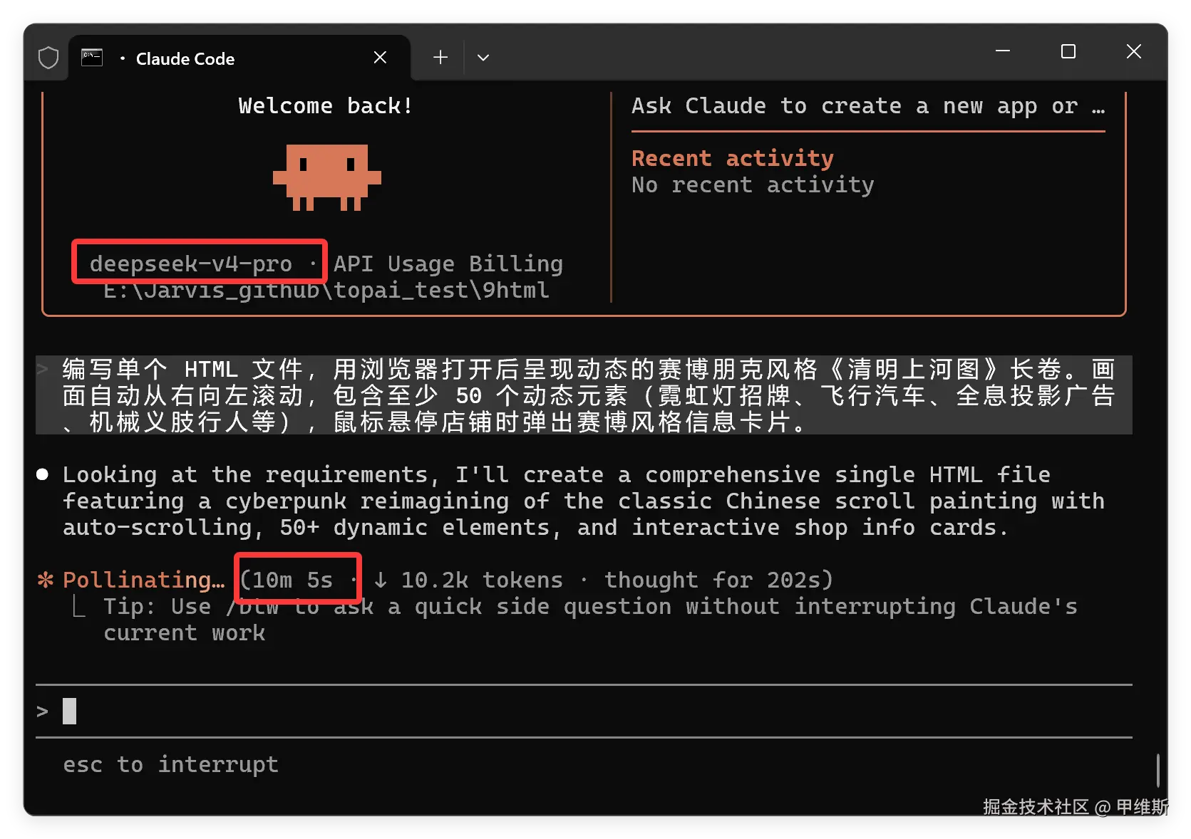 DeepSeek 在官方文章中说了,专门对 Claude Code 等智能体工具做了优化训练,它们家也完全支持 Anthropic 协议。所以,我就选 CC 作为测试工具。
