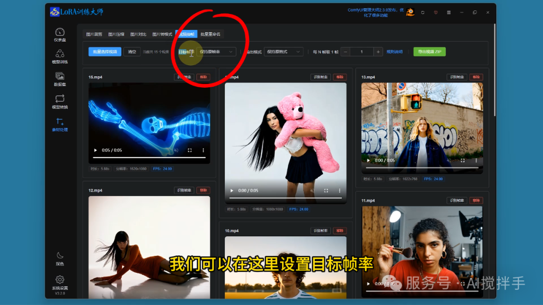 帧率转换:将视频统一转换为目标帧率(如24fps→16fps)