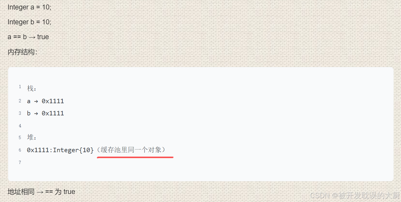 0x1234:Integer{ value=10 } (缓存池里的固定对象)
