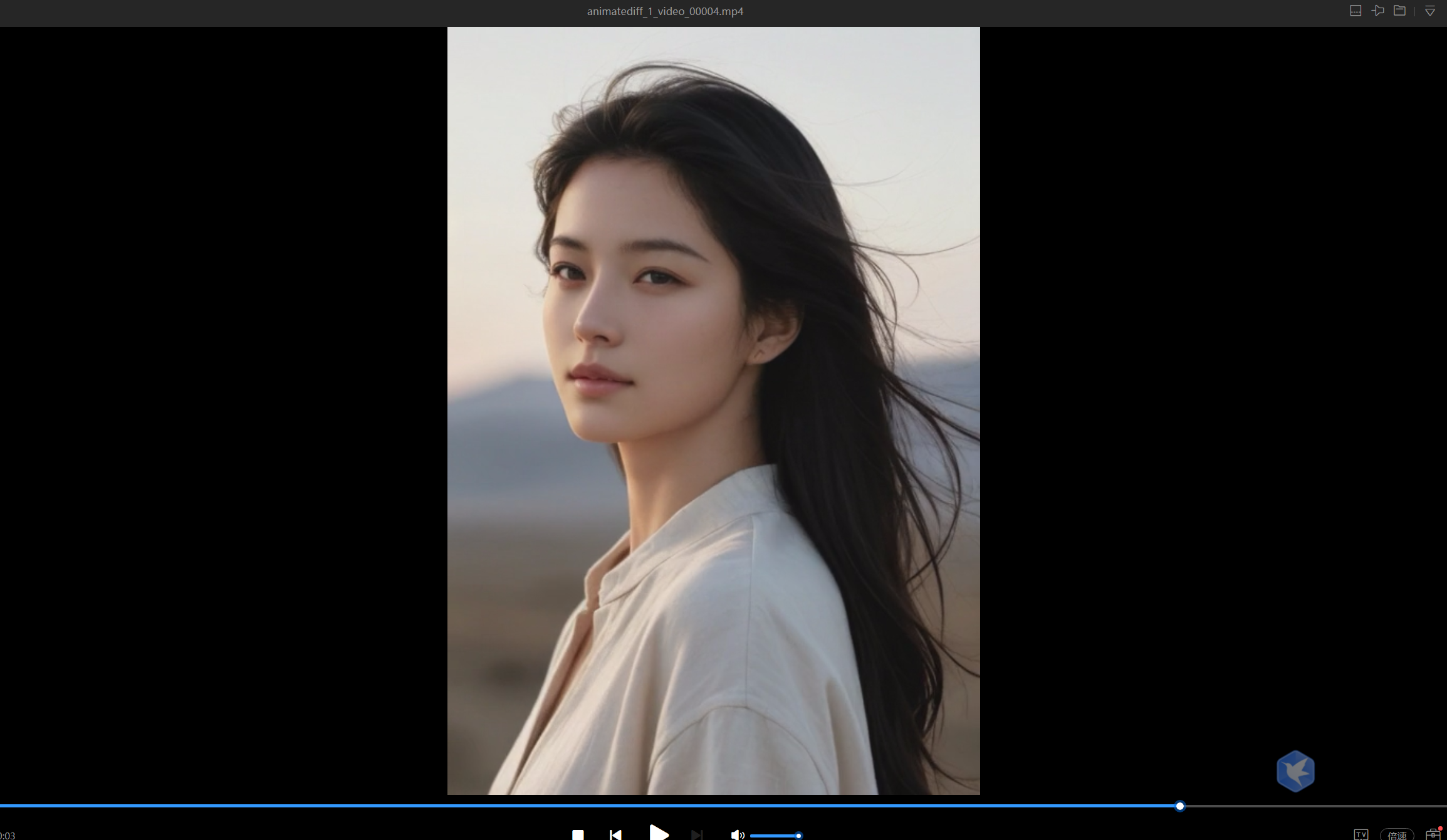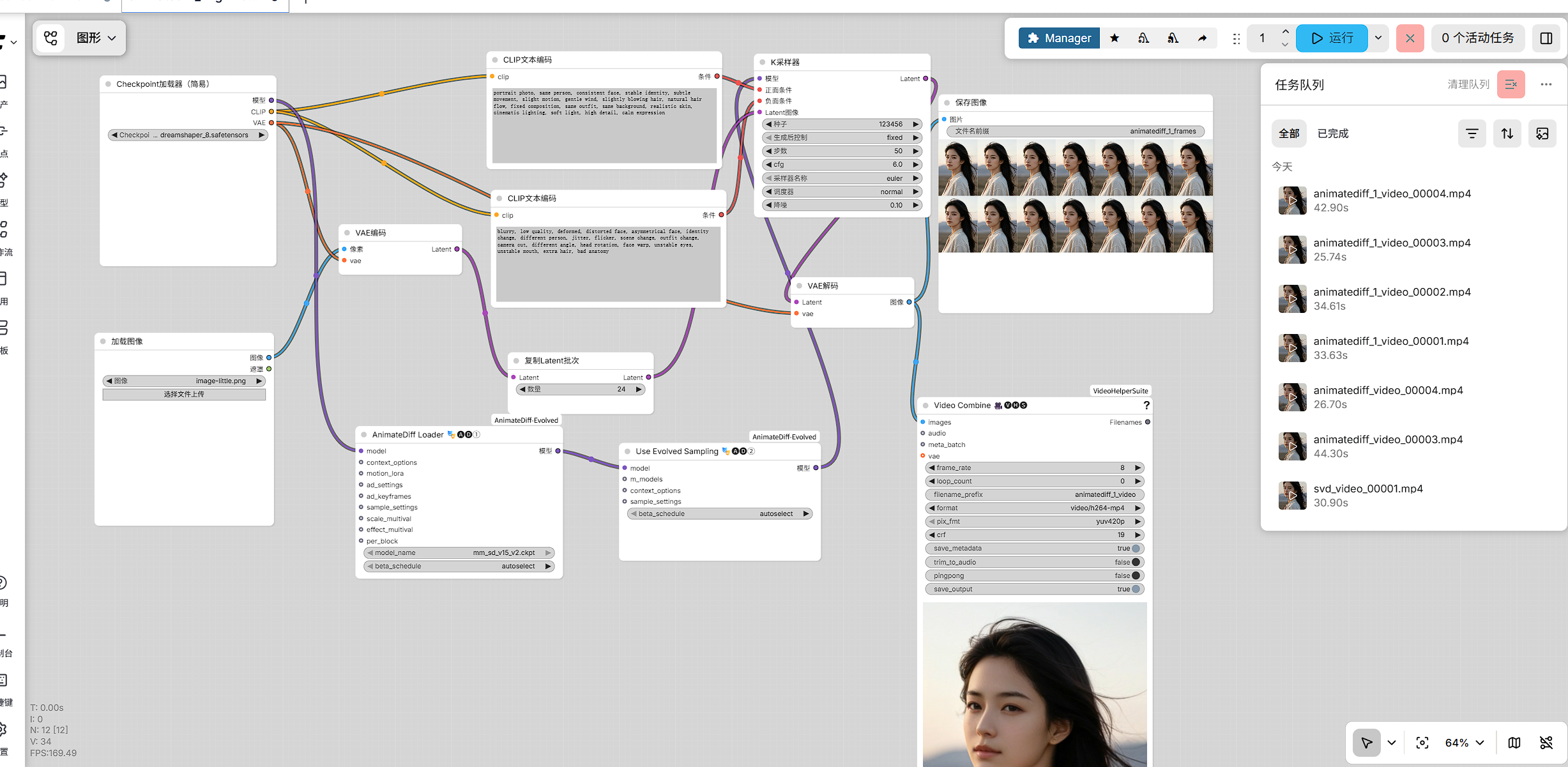 这表明视频并非由单张图简单重复构成,而是通过 AnimateDiff 的运动建模参与采样过程,在潜空间中形成连续变化,从而输出一组具有时序相关性的图像帧。