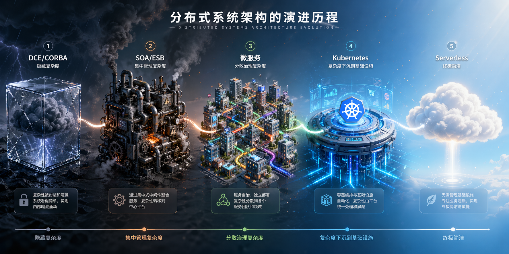 从最早期的 DCE、CORBA,到 SOA 时代的 ESB,再到微服务、Kubernetes、Serverless,每一次技术范式的转变,本质上都在回答同一个问题:这些用不掉的复杂度,到底放哪最合适?